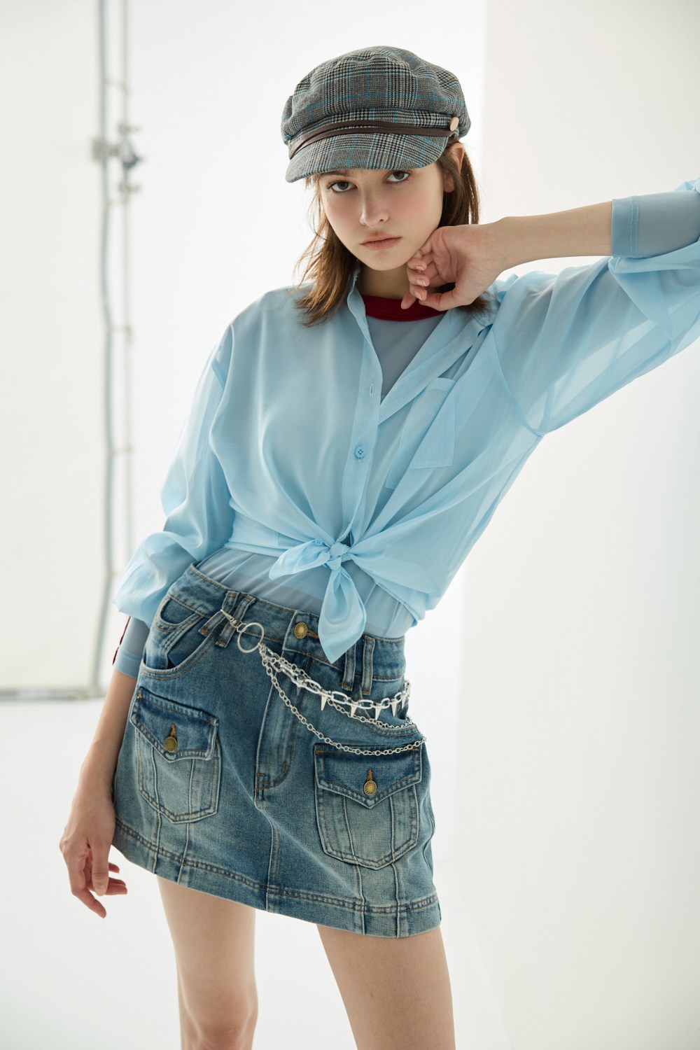 氣質雨霧藍燙鑽微刷破牛仔短裙 - 清新蔚藍