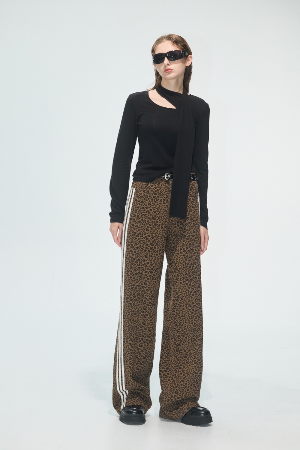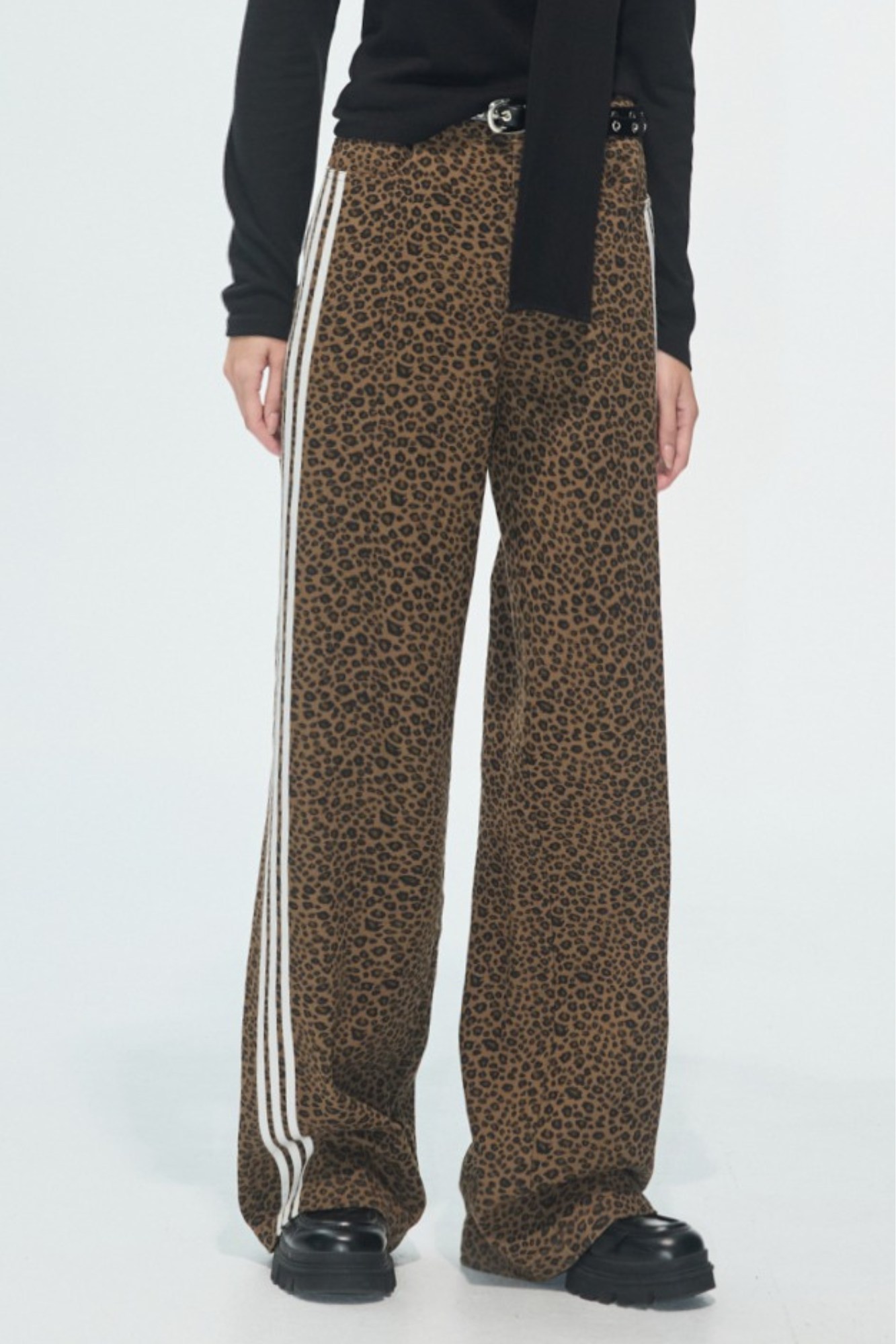 豹紋女孩側編配條寬褲 - 古樸咖啡