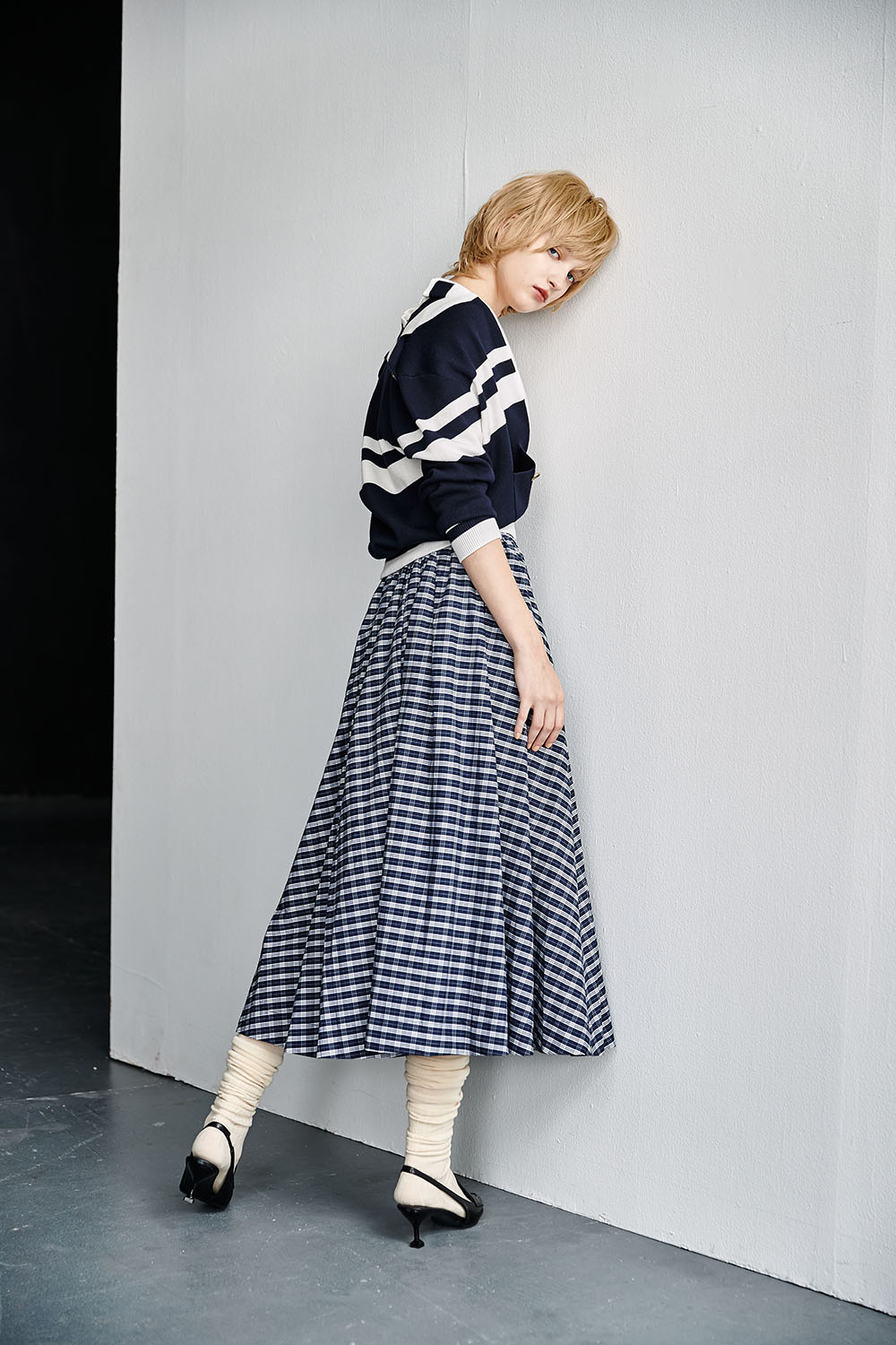 逐光行進格紋細褶長裙(附綁帶) - 寧靜黛藍, S