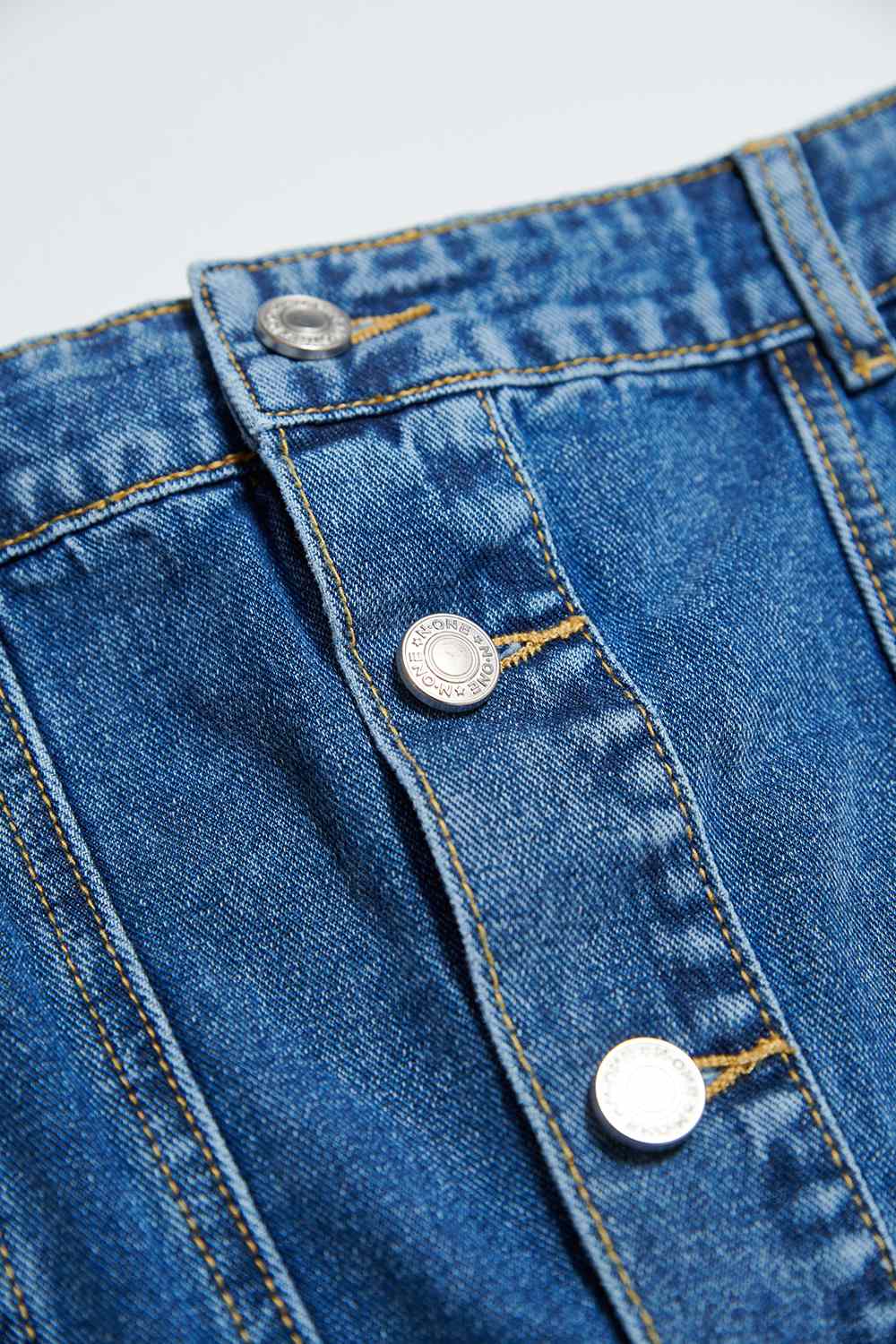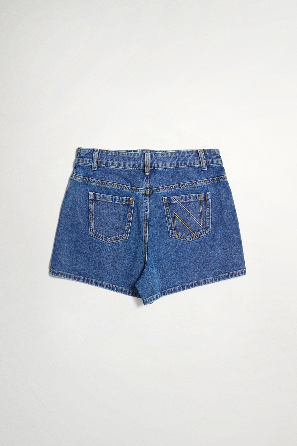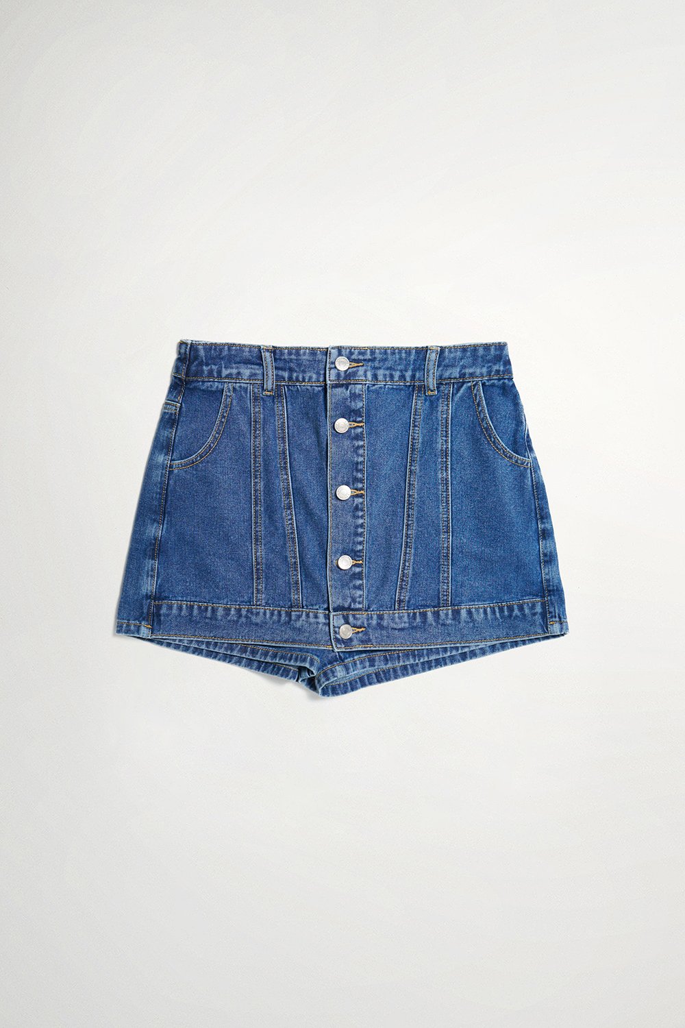某日清晨拼接織紋排釦牛仔短裙褲 - 寧靜黛藍, L