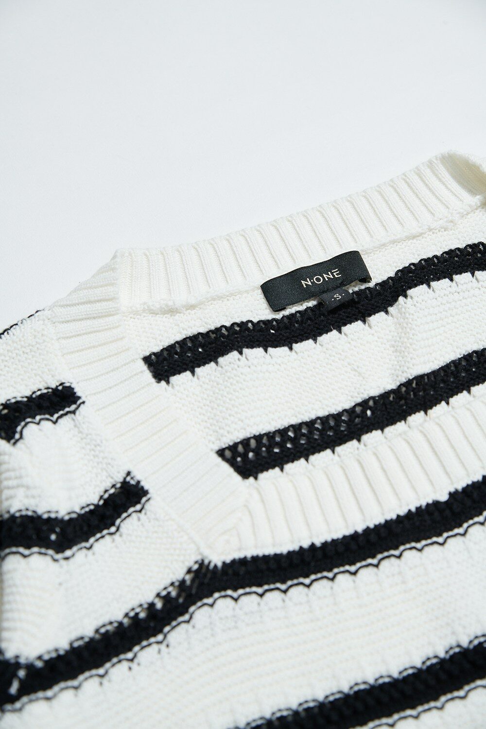 境忽陪想方領鏤空條紋收腰針織上衣 - 無瑕純白, M