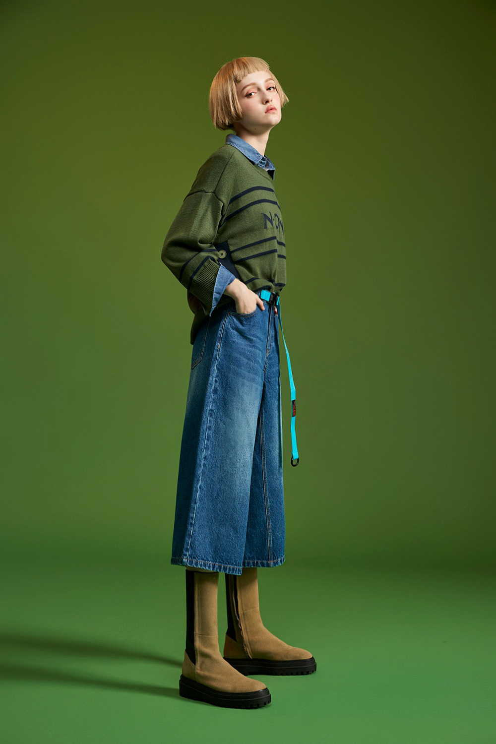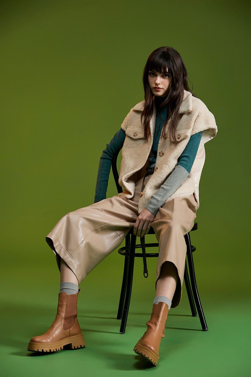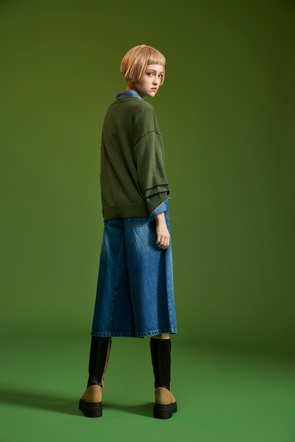 落肩搭配著兩側排釦含蓄而自在 佐以暮綠色為理想加分