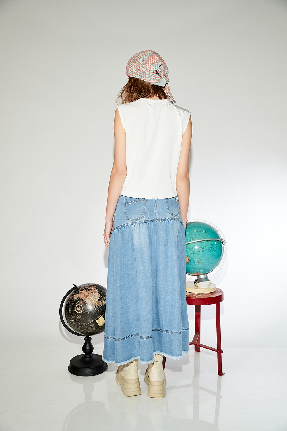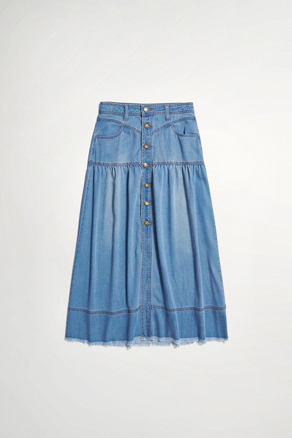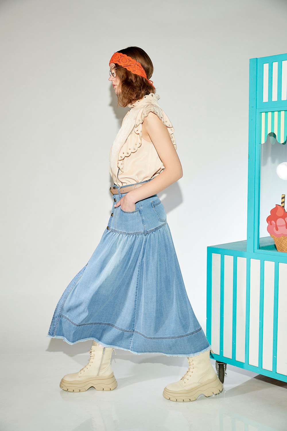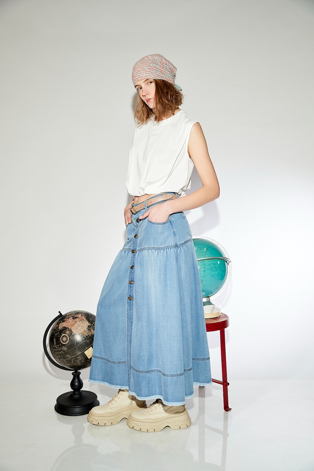 隨見知蘊細褶垂墜感高腰排釦牛仔長裙