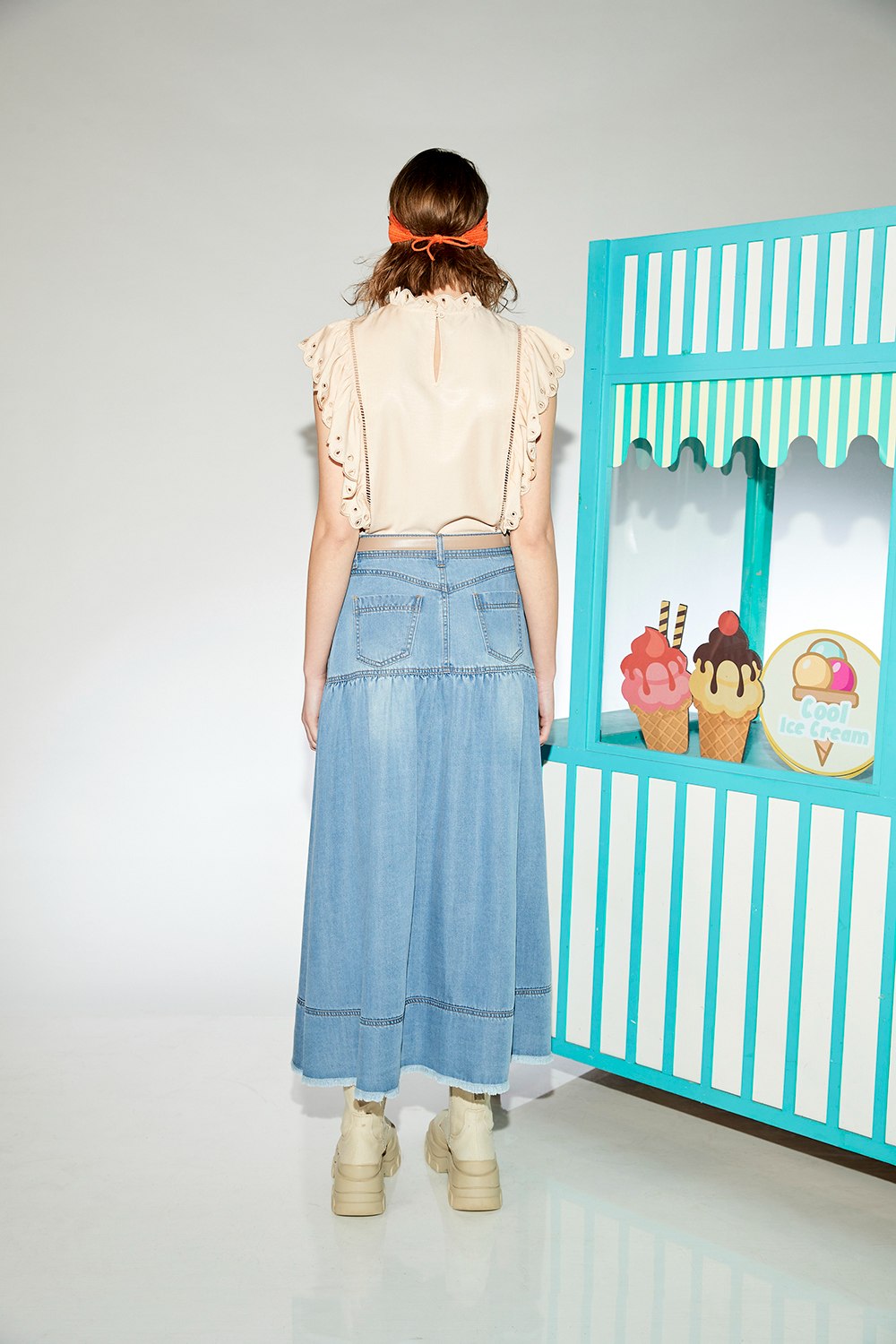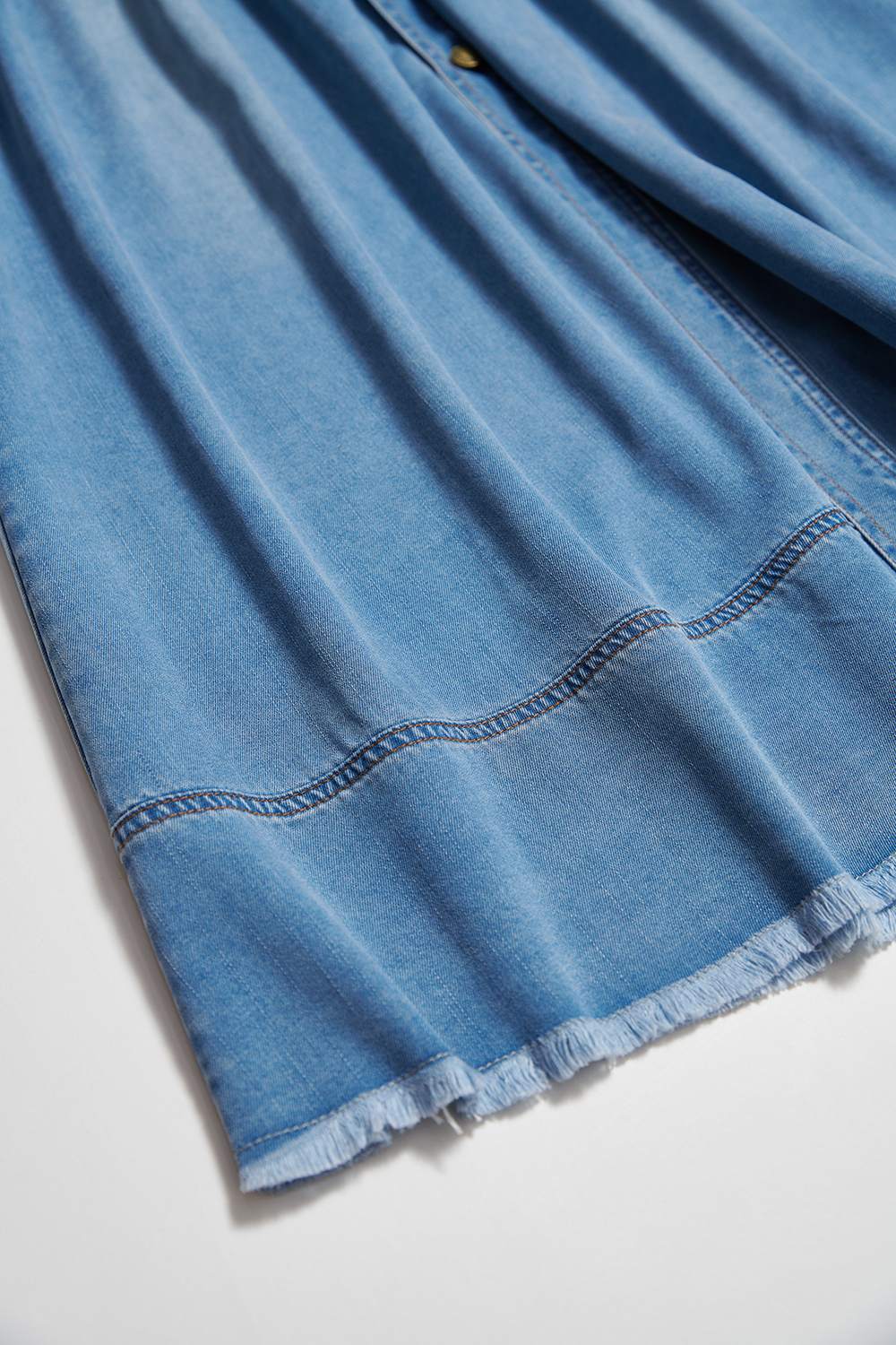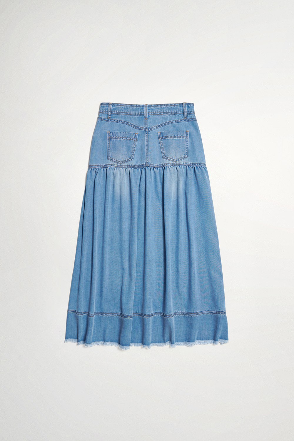 隨見知蘊細褶垂墜感高腰排釦牛仔長裙