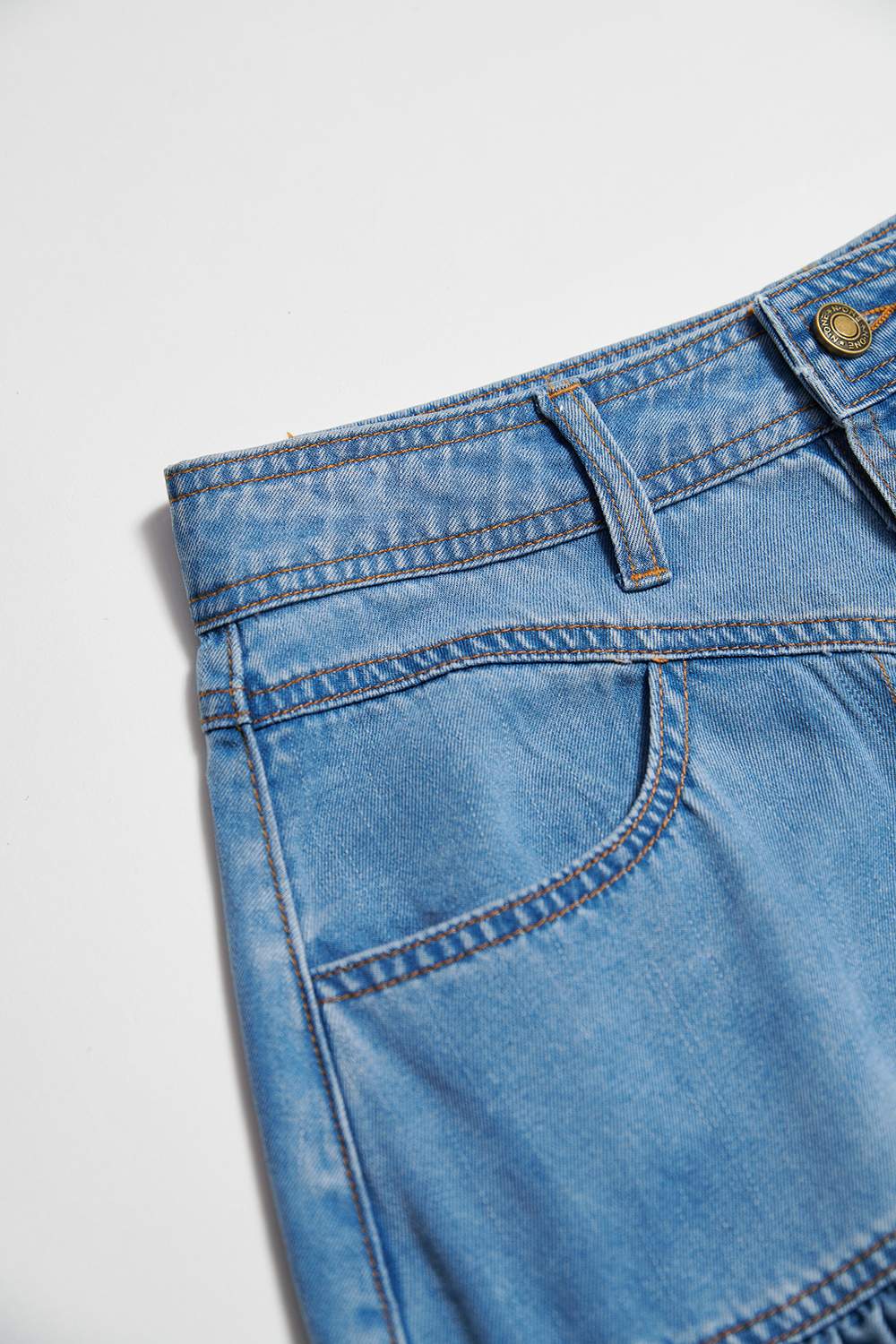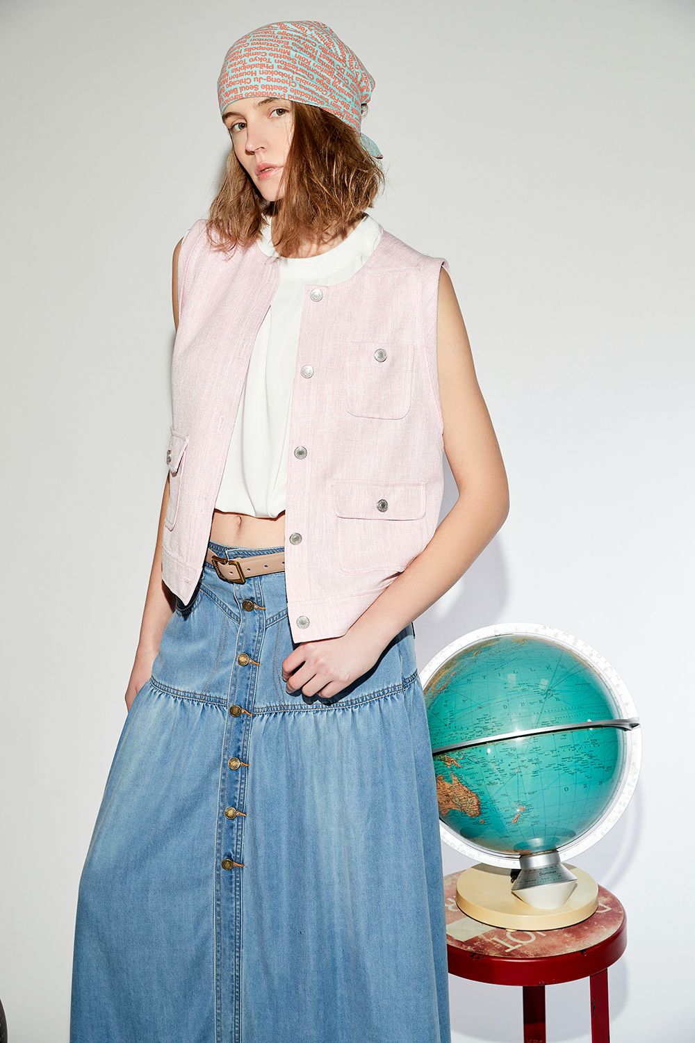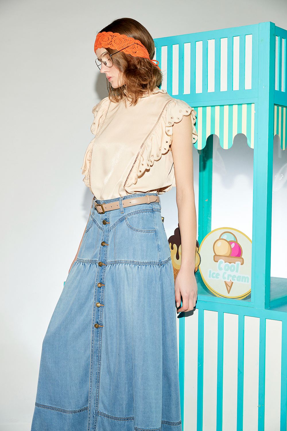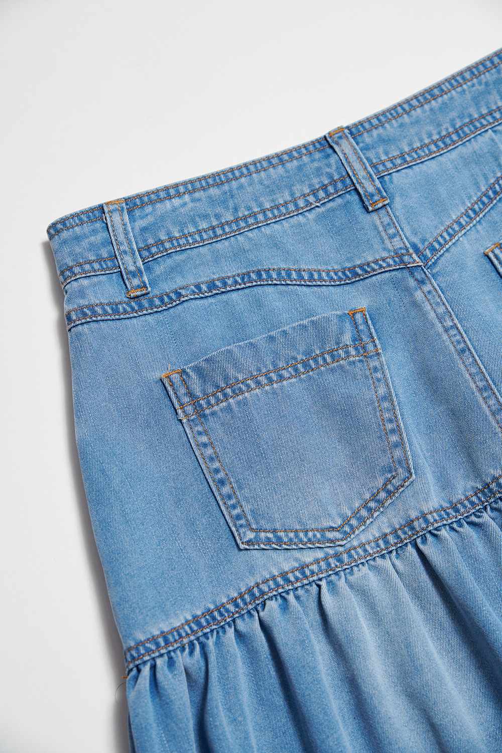 隨見知蘊細褶垂墜感高腰排釦牛仔長裙