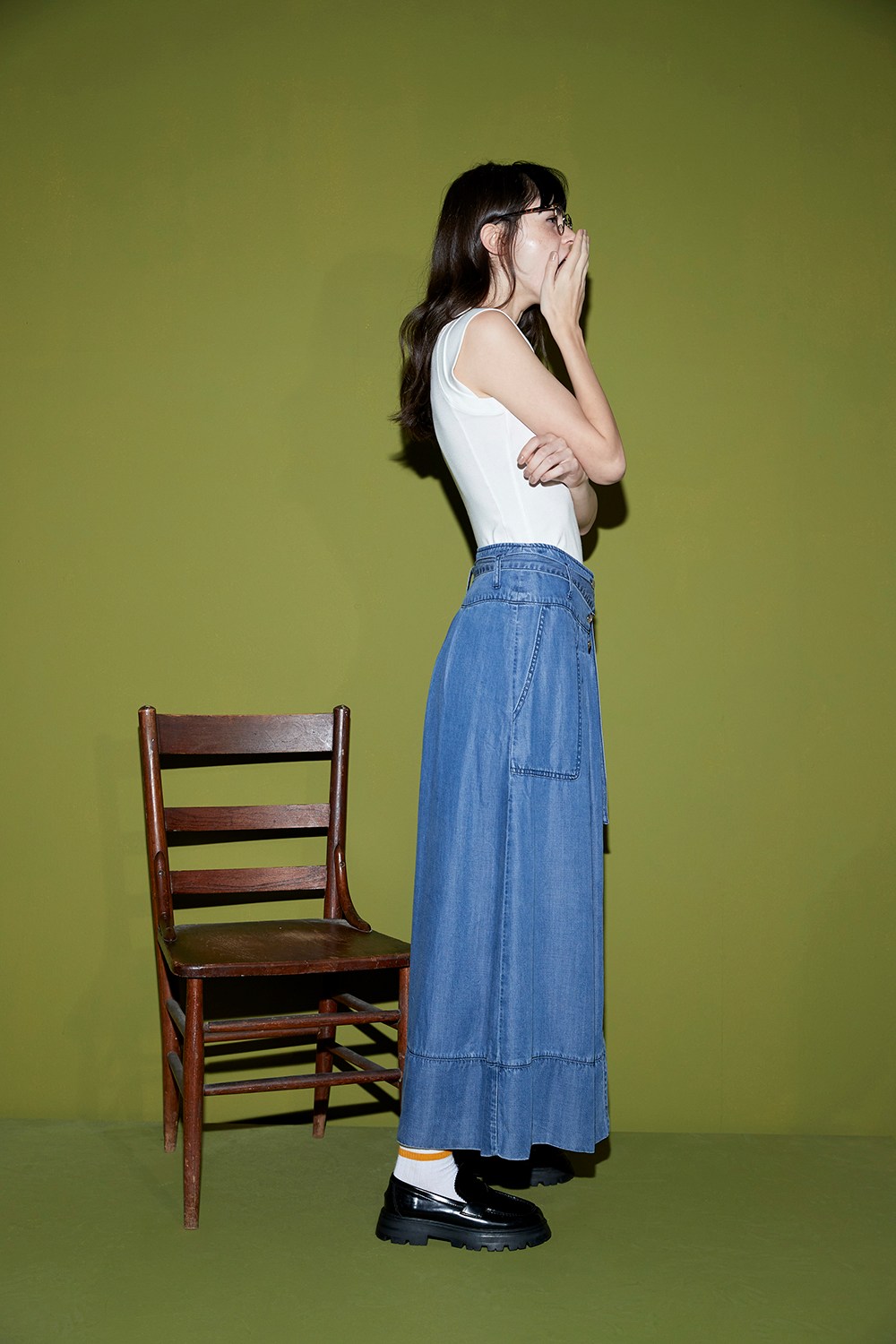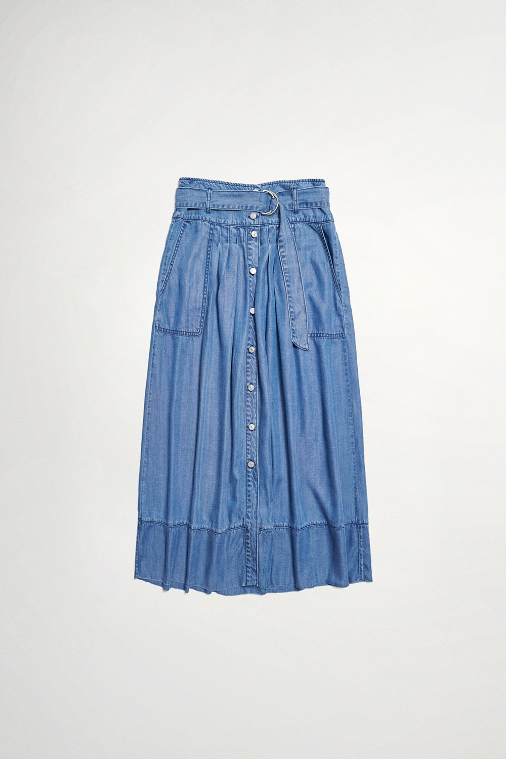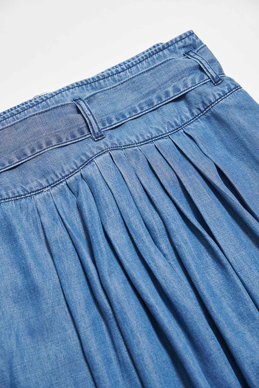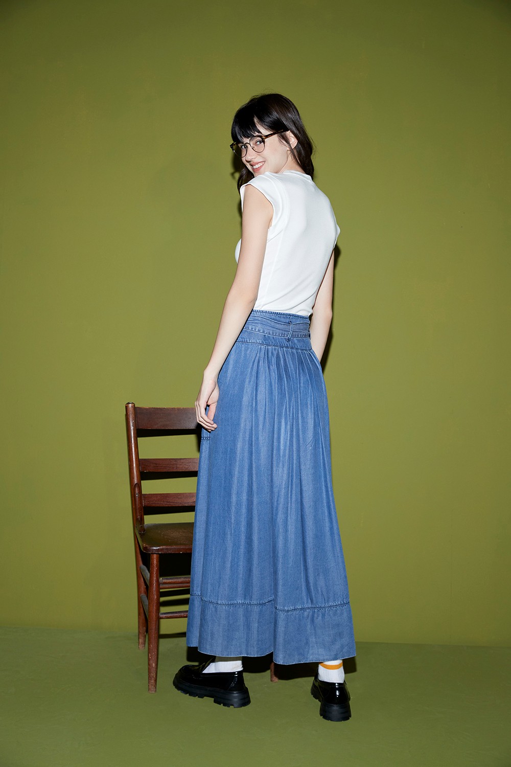 透想亮光絲感排釦壓褶牛仔長裙(附腰帶) - 寧靜黛藍, S