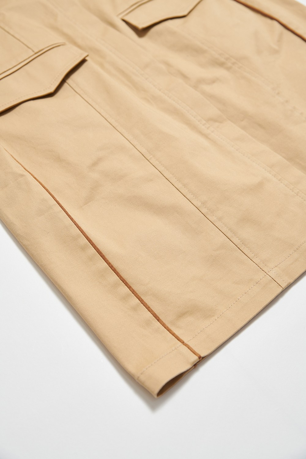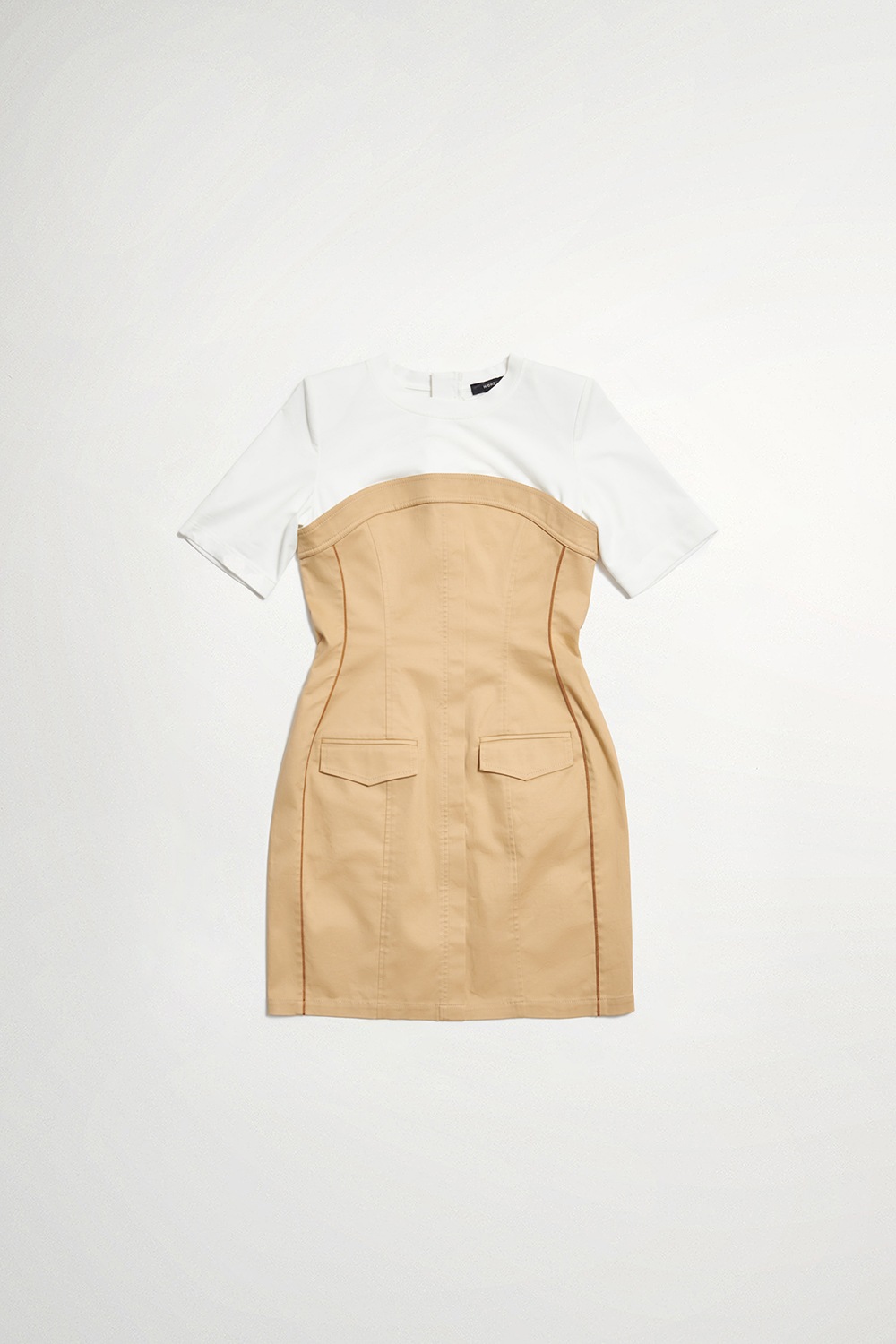 拼接裡可以展現視覺的性感比例,較短版的設計讓你可以搭上迷人長靴踏出自信步伐,同時能修飾著小腿線條,更加筆直,或穿上短版且帶有挺度的外套綻放率性,同時呼應裙的微挺質感。