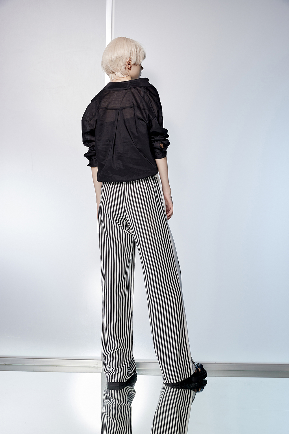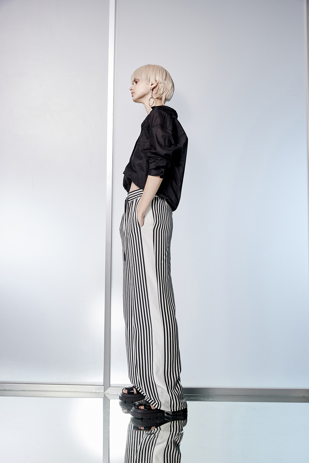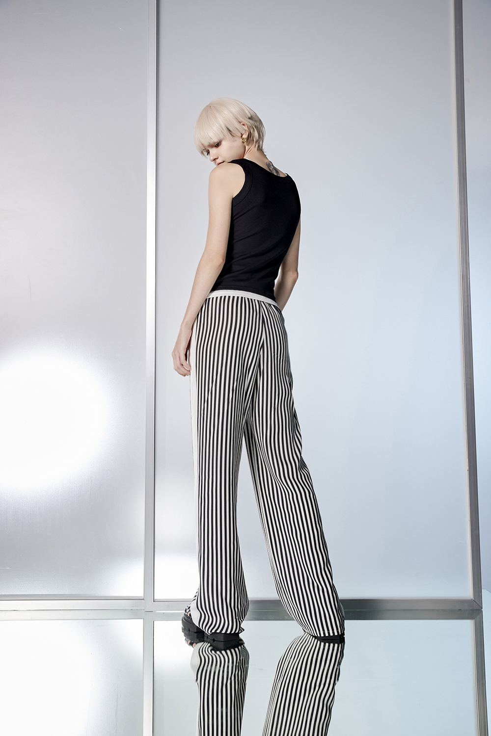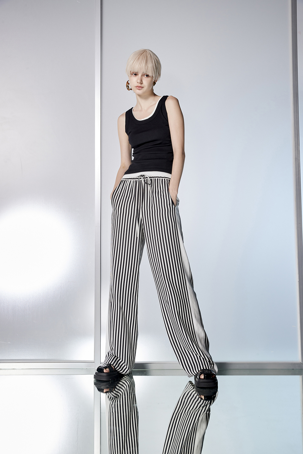 初醒感性條紋鬆緊落地寬褲 - 無瑕純白, 40