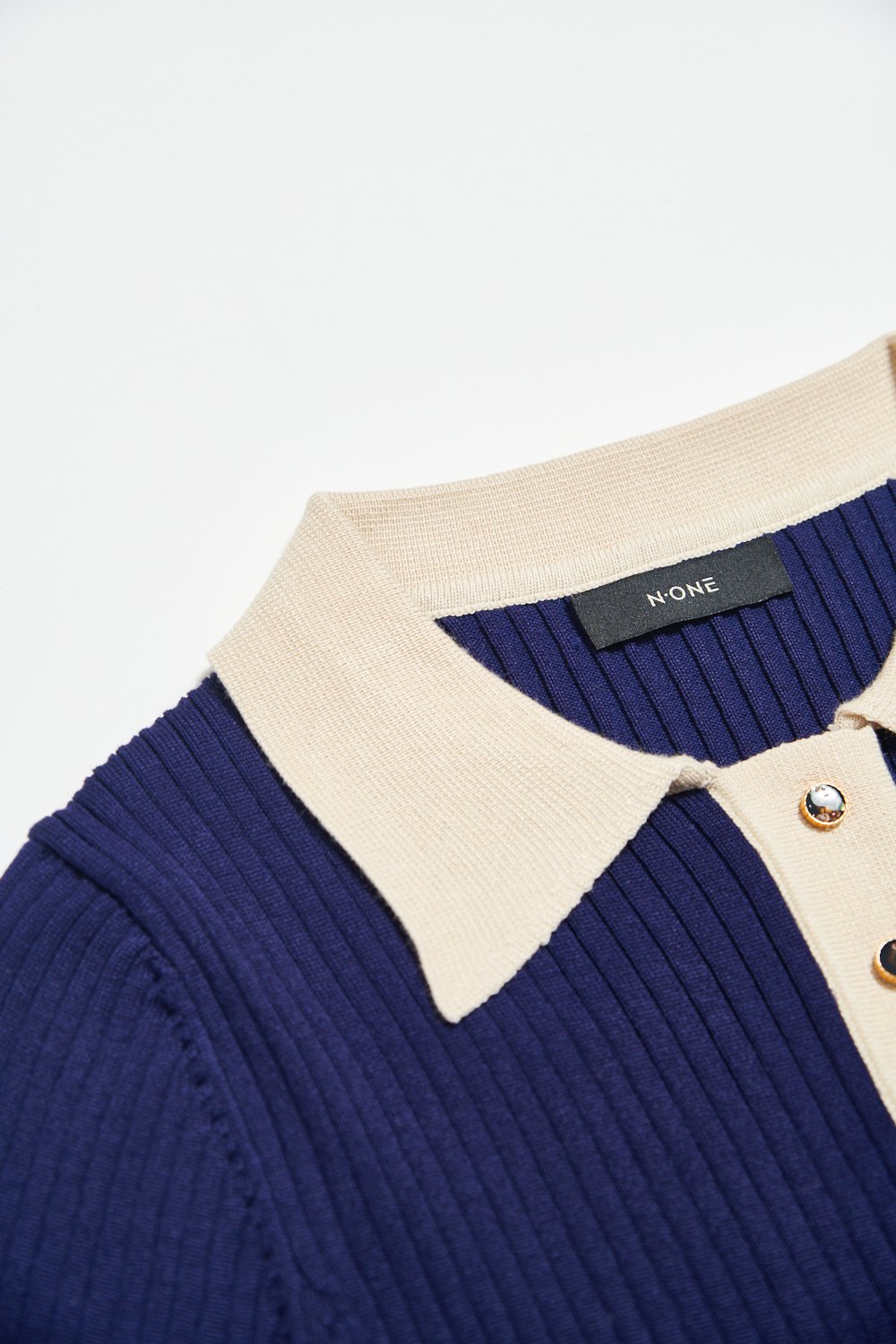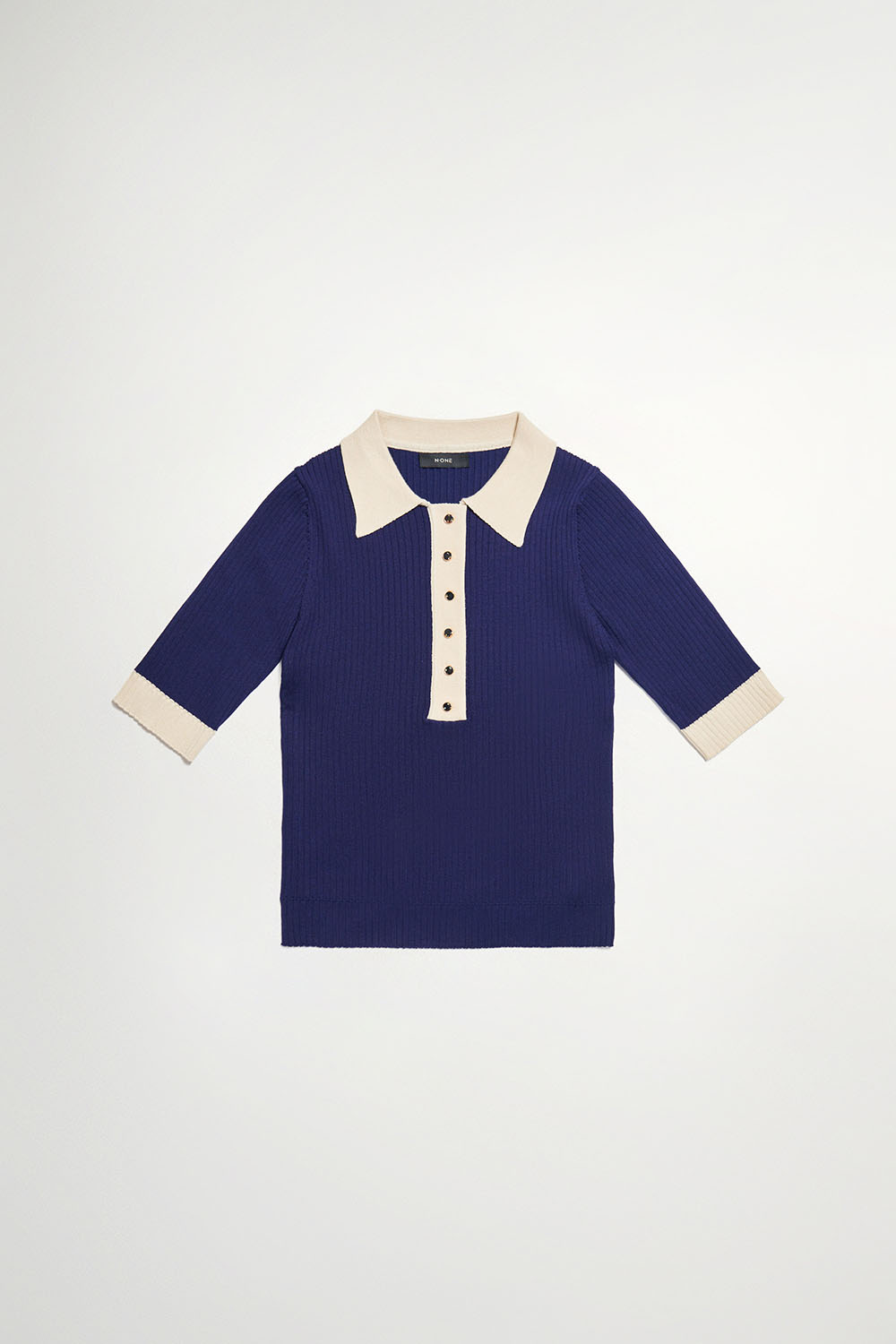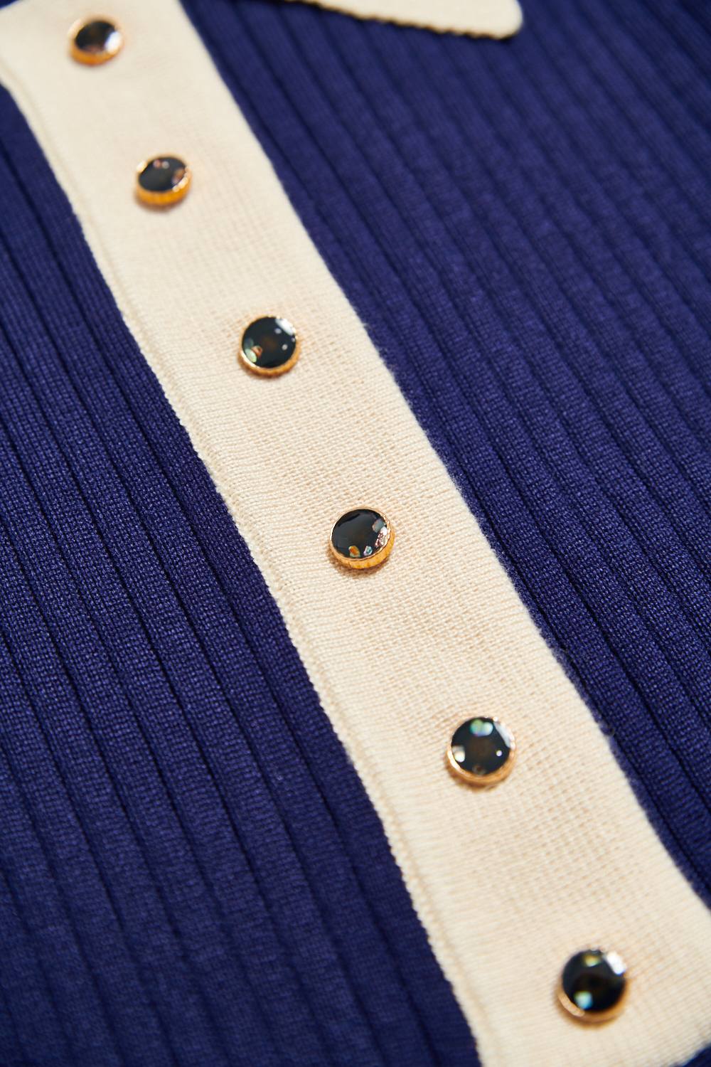 尋間呢喃拼色五分袖鈕釦上衣 - 深邃藏藍, F