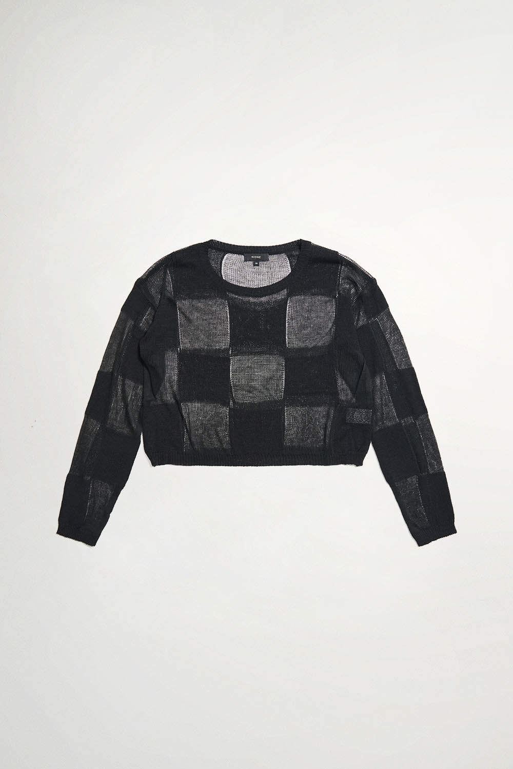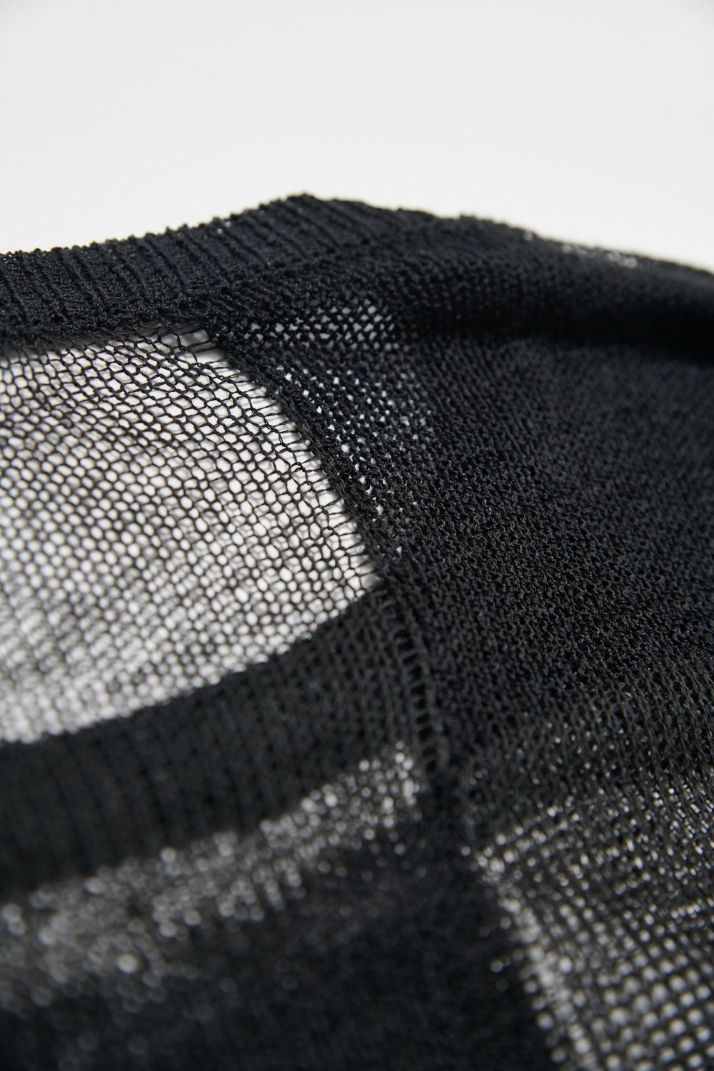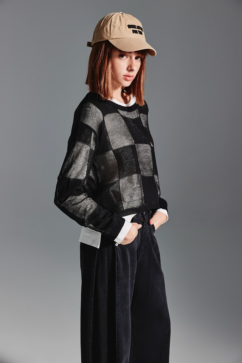 透膚拼色黑白方格針織上衣 - 神祕純黑, 36