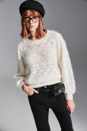 霧漫白霜蕾絲感針織上衣 - 奶油杏色, 36