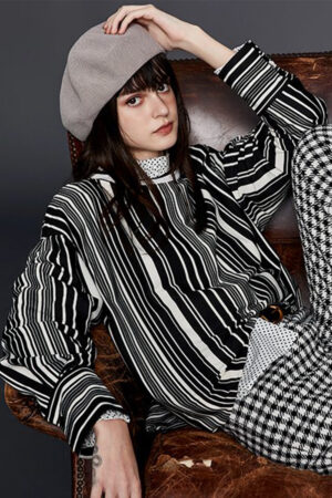 典雅黑白條紋圓領上衣 - 神祕純黑, 38