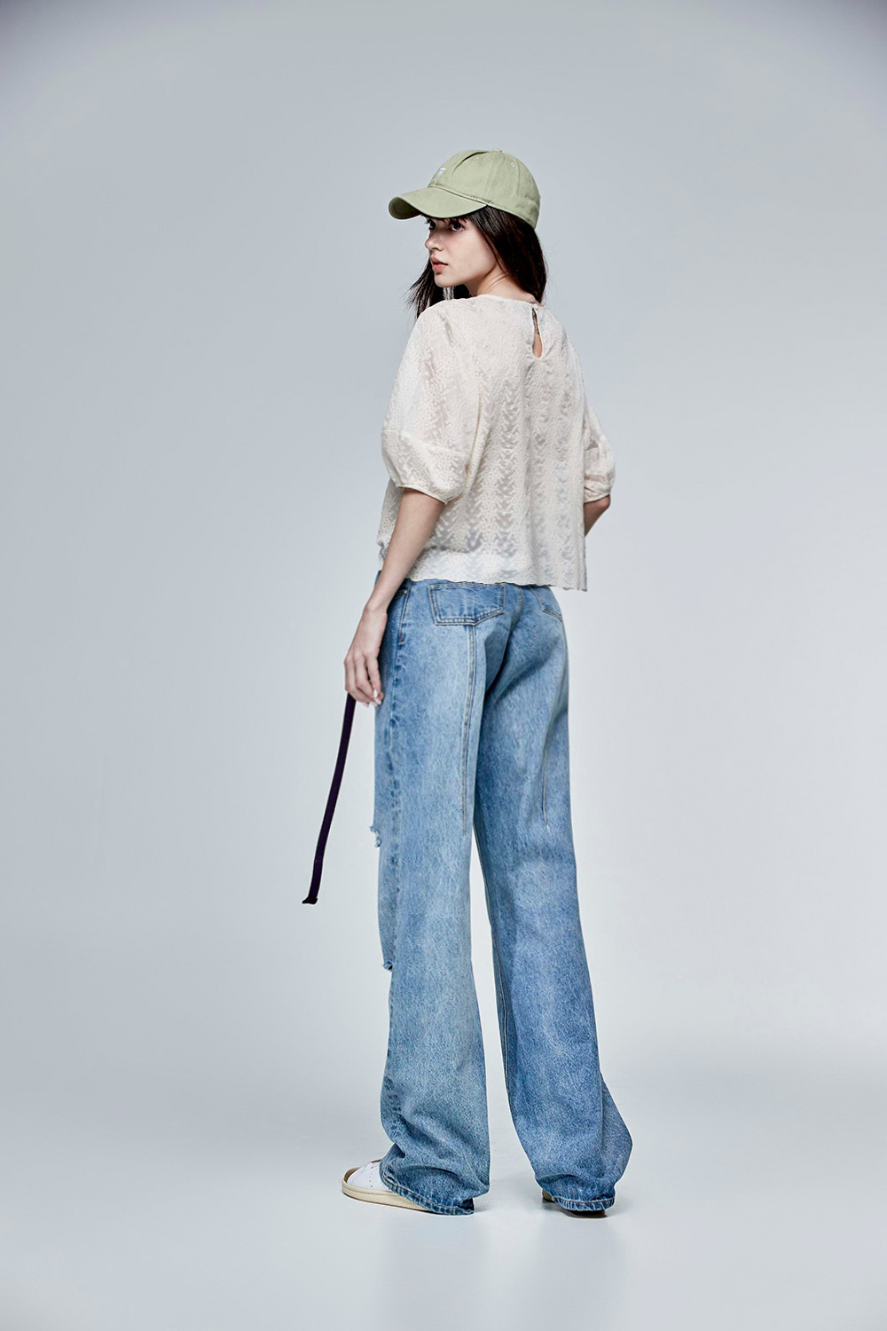 甜味春風花瓣邊繡花寬袖上衣 - 奶油杏色, 40