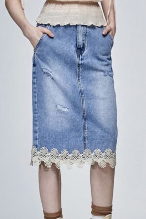 蕾絲公主拼接開叉牛仔裙 - 寧靜黛藍, 36