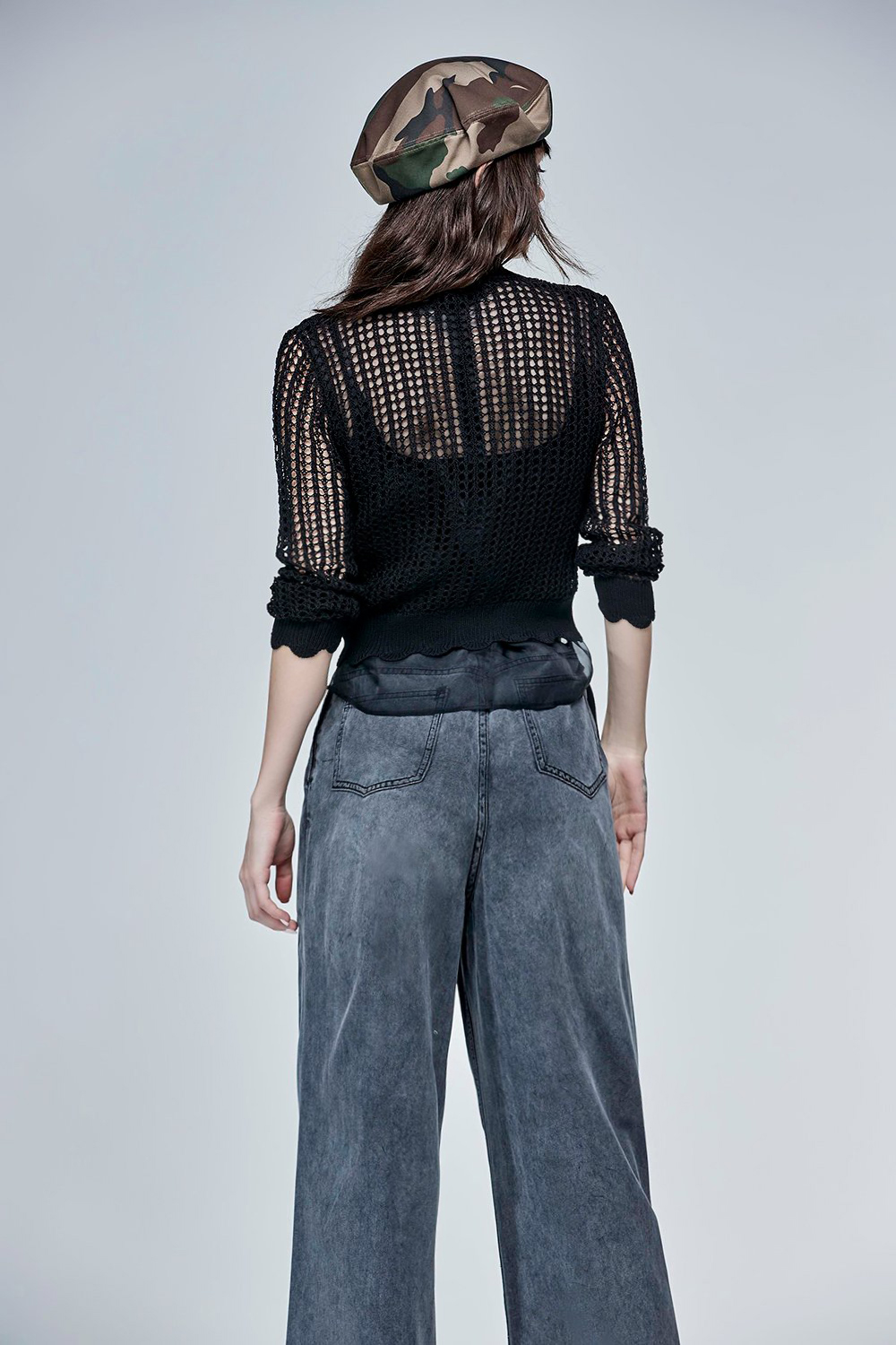 暗夜魅影花邊簍空針織外套 - 神祕純黑, 38