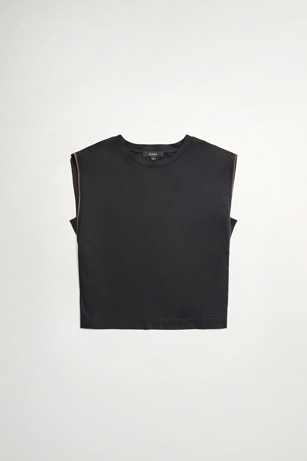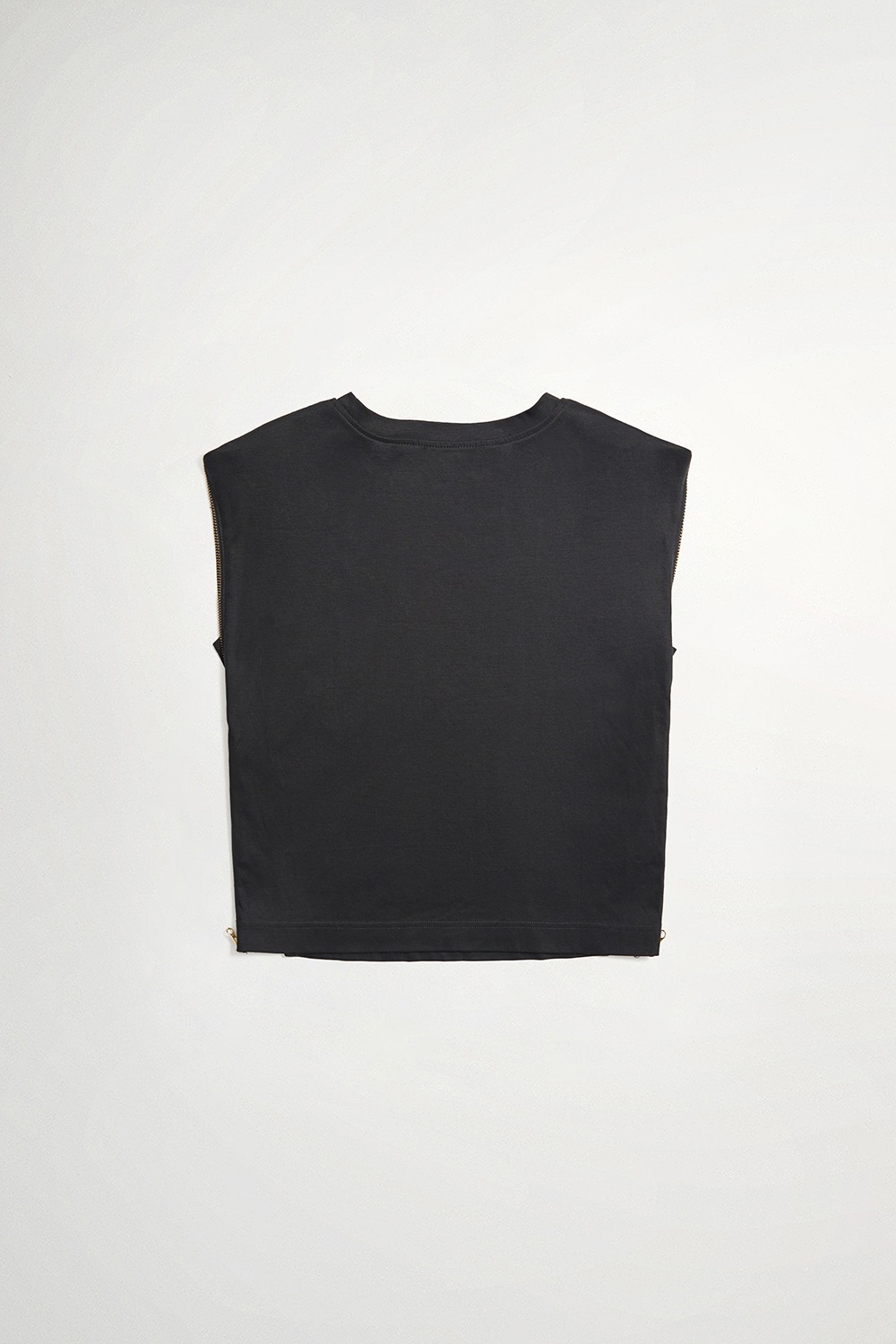 衣服兩邊拉鏈設計,為單一黑色上衣,多了一份設計感!