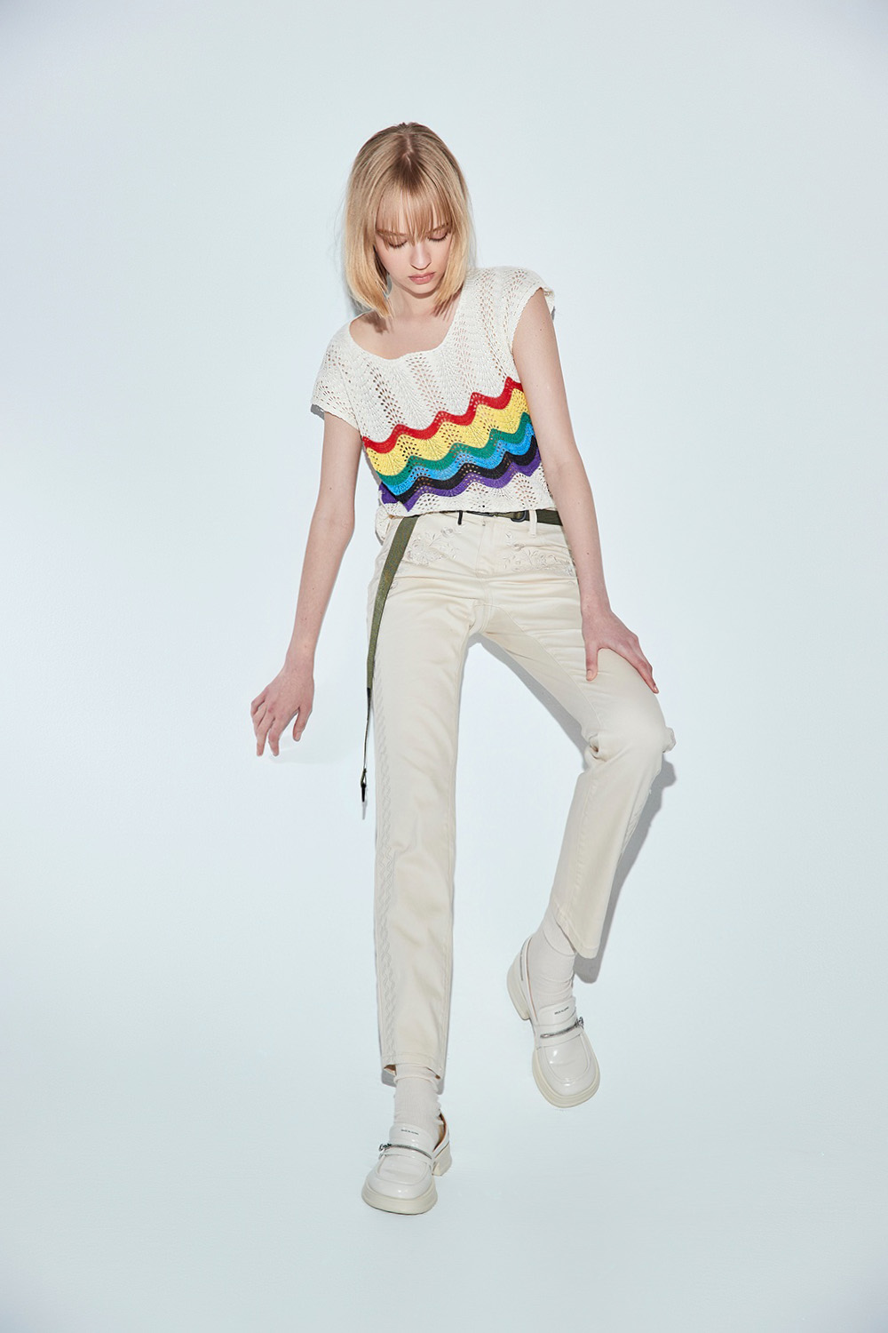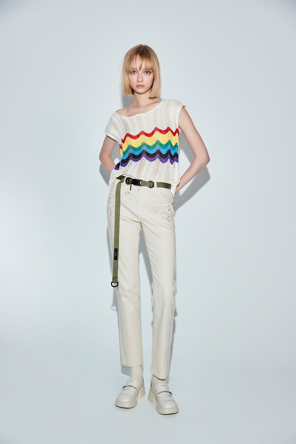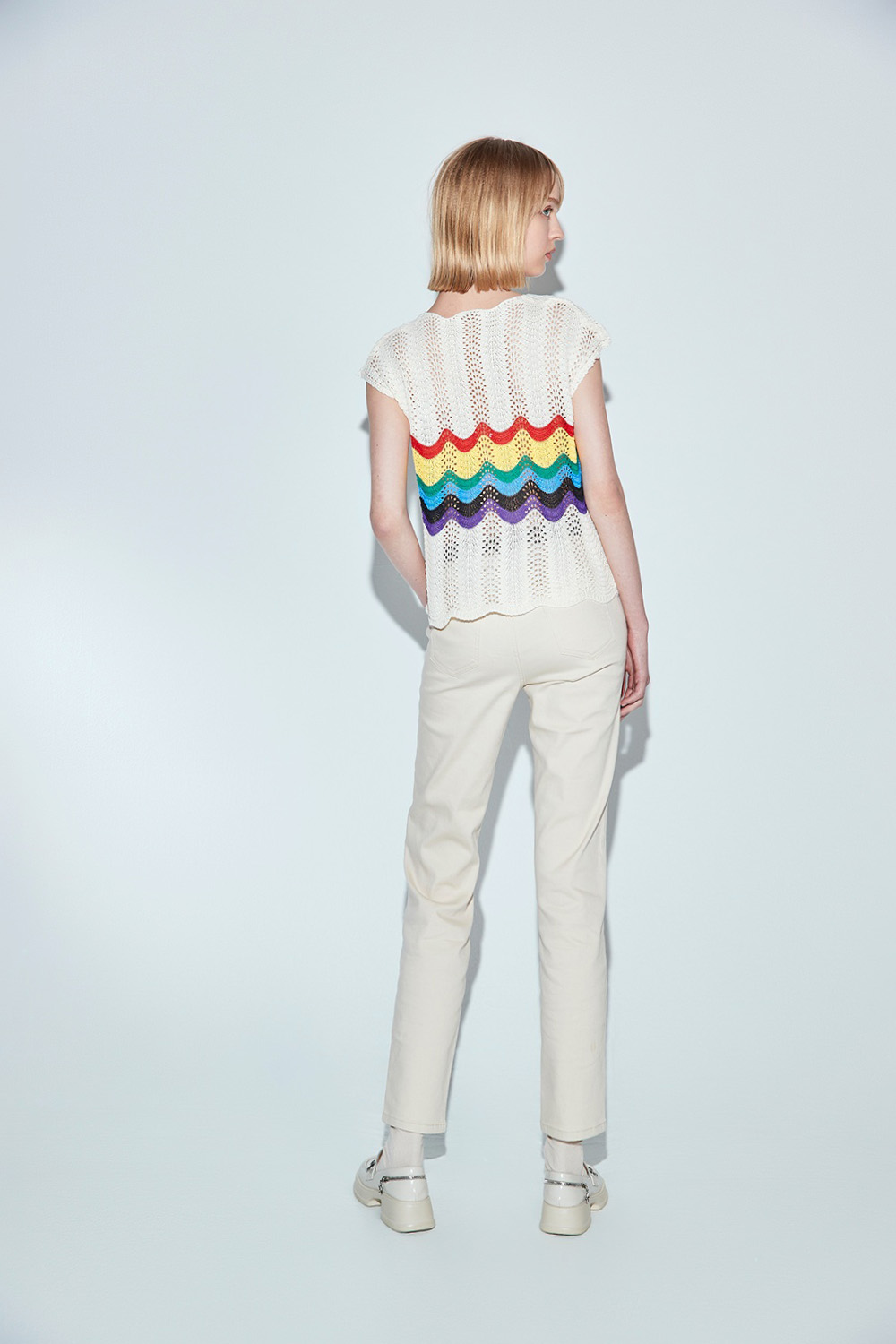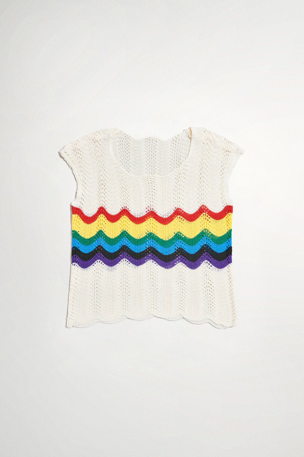 彩虹假日鏤空波浪針織上衣 - 奶油杏色, F