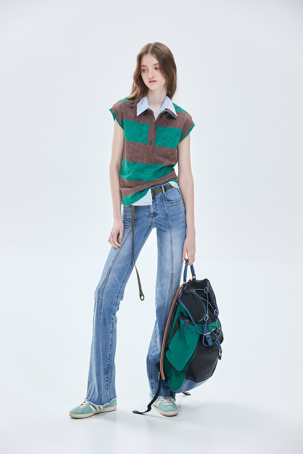 西野暮色洗舊感配色條紋上衣 - 平靜翠綠, 36