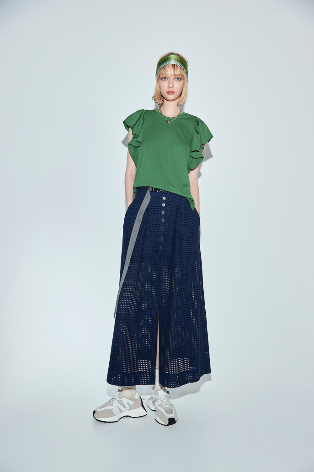 高級內斂格紋洞洞開衩裙 - 深邃藏藍, 40