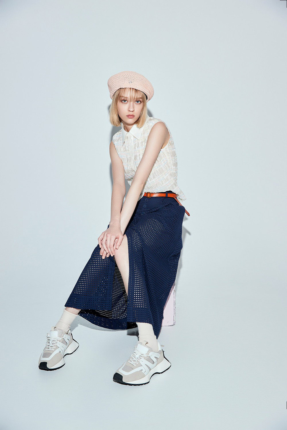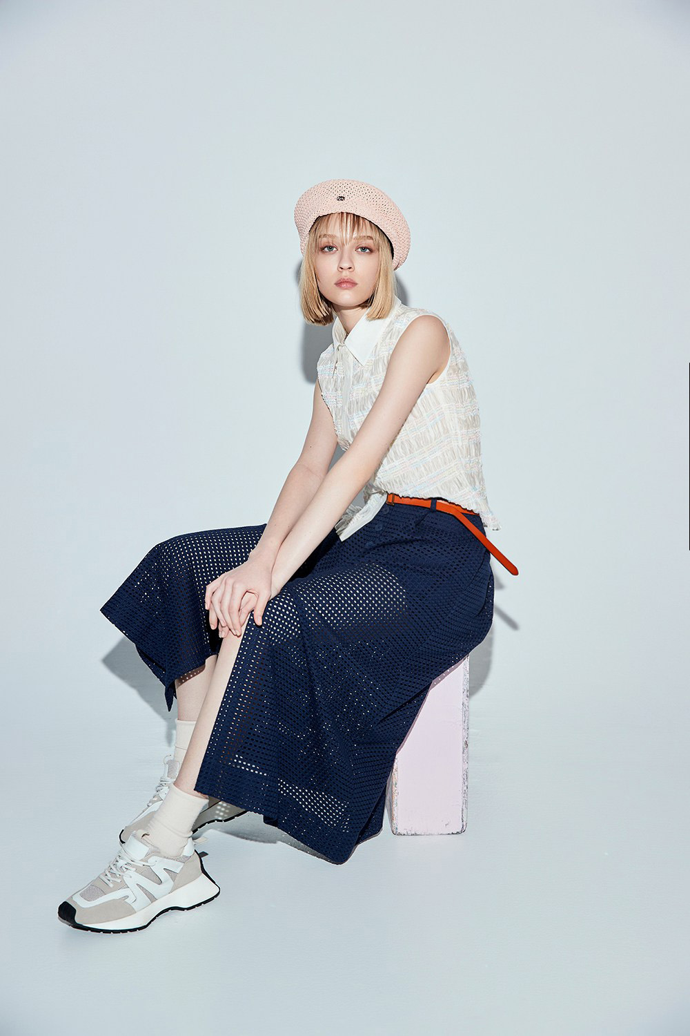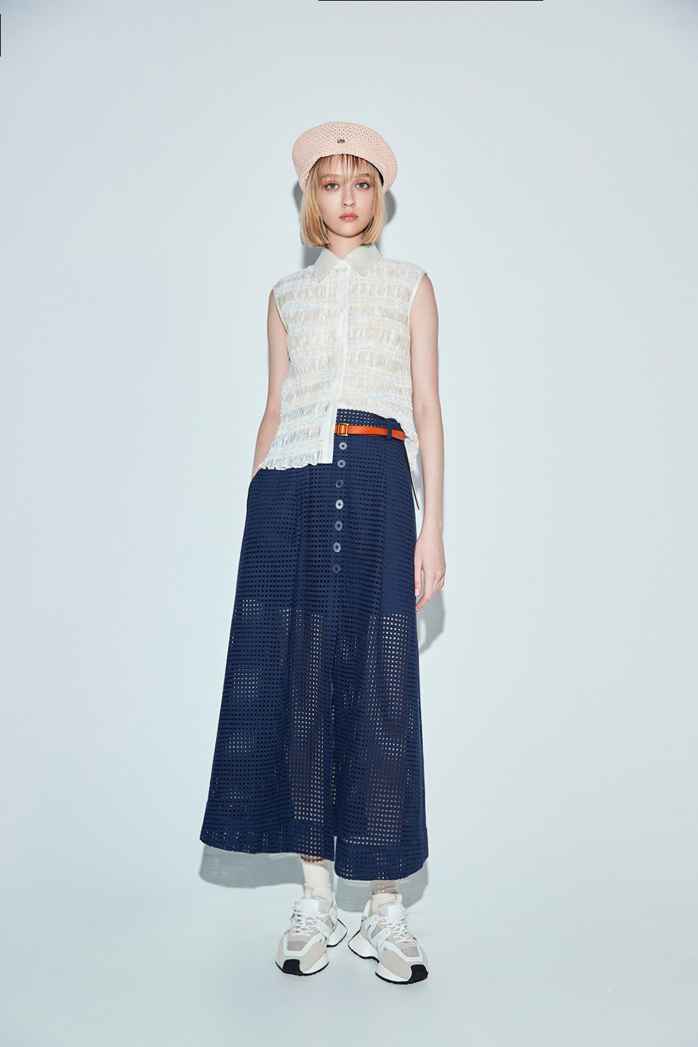 高級內斂格紋洞洞開衩裙 - 深邃藏藍, 38