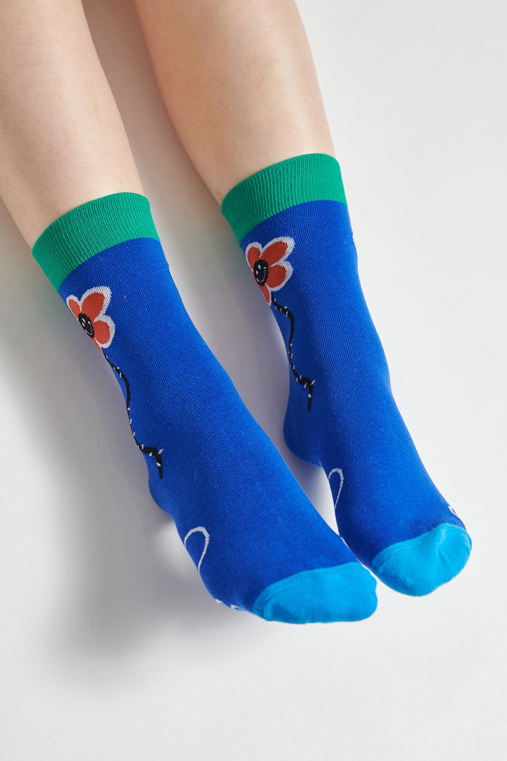 跳色微笑小花•中筒襪 - 深邃藏藍, F
