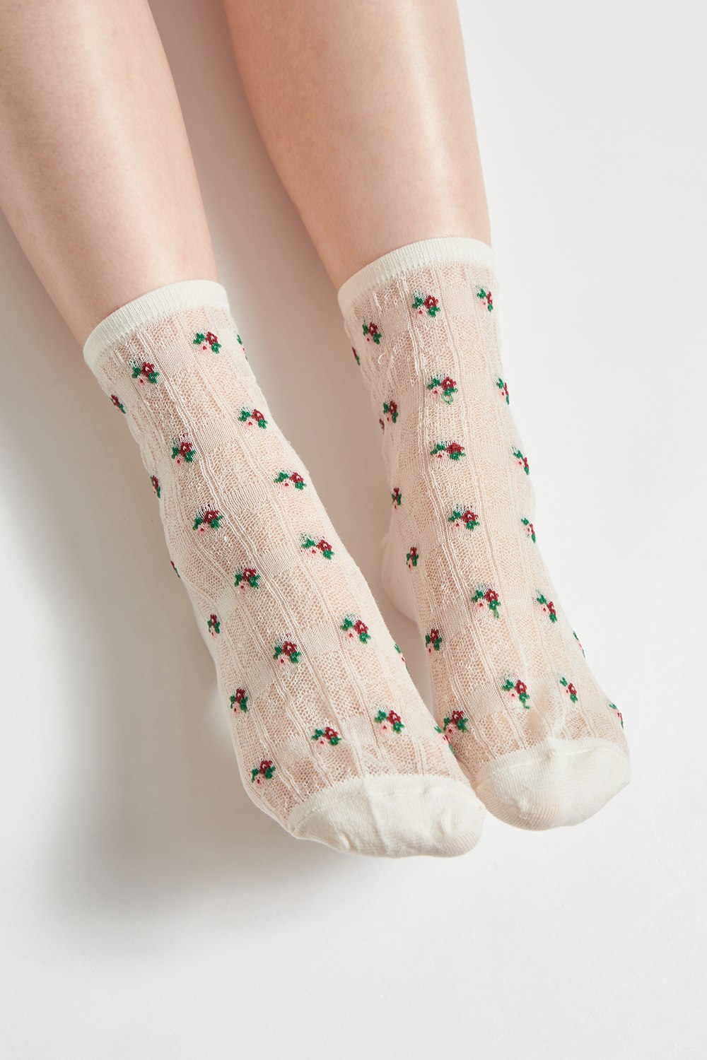 透膚法式小花•中筒襪 - 無瑕純白, F