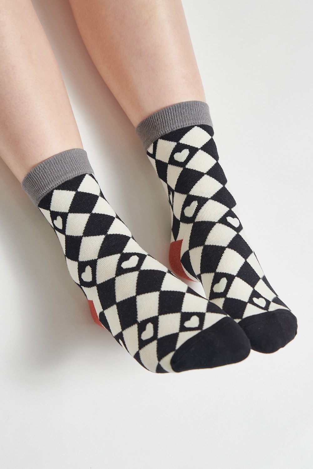 立體感愛心菱格•中筒襪 - 神祕純黑, F