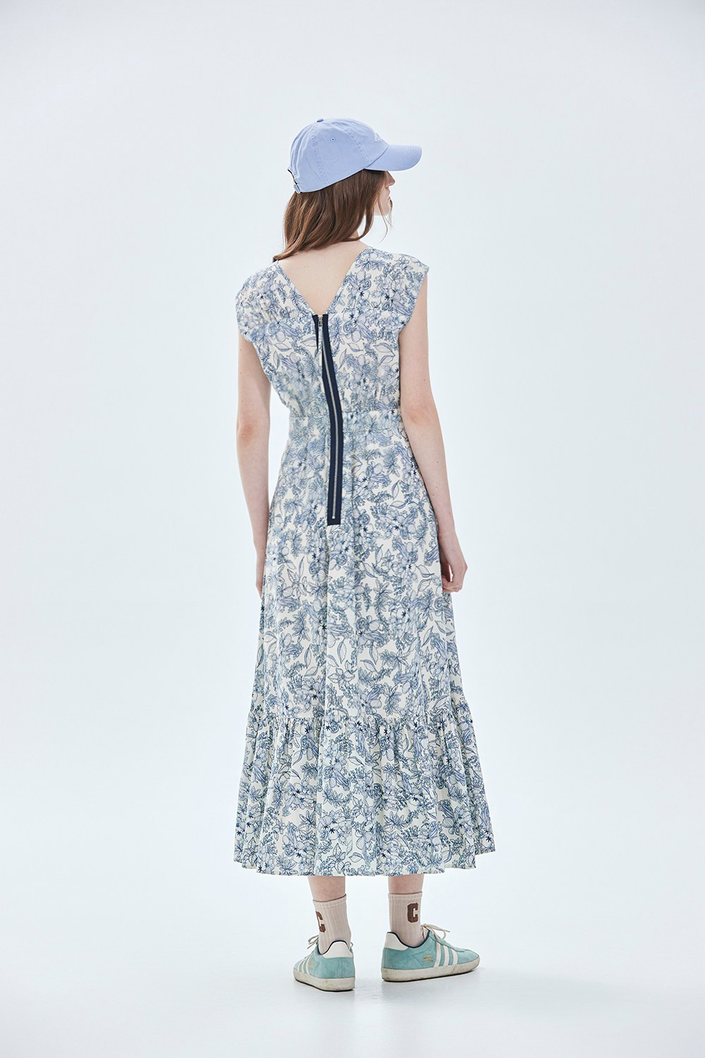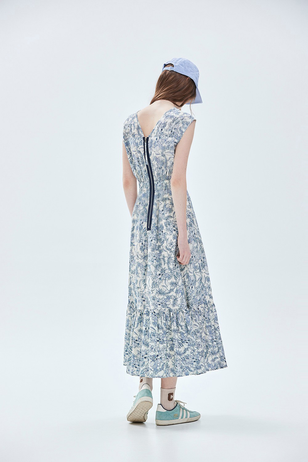 幽靜庭園長版印花蛋糕裙洋裝 - 寧靜黛藍, 36