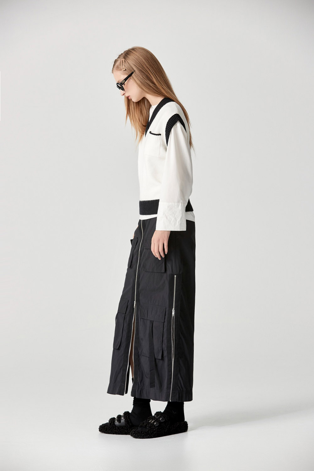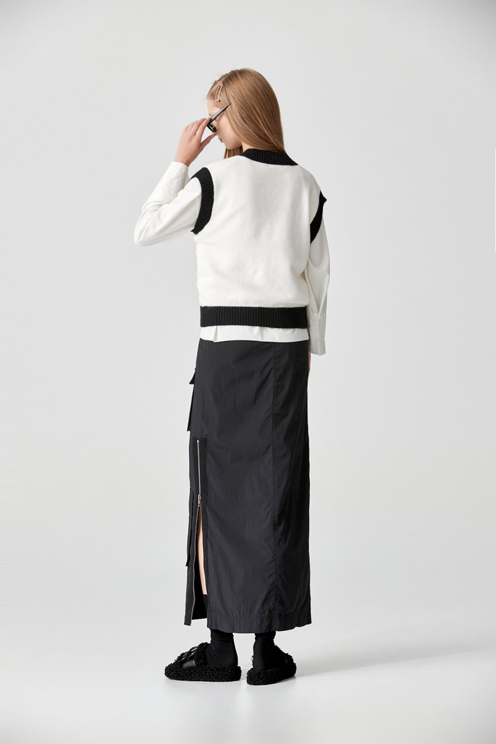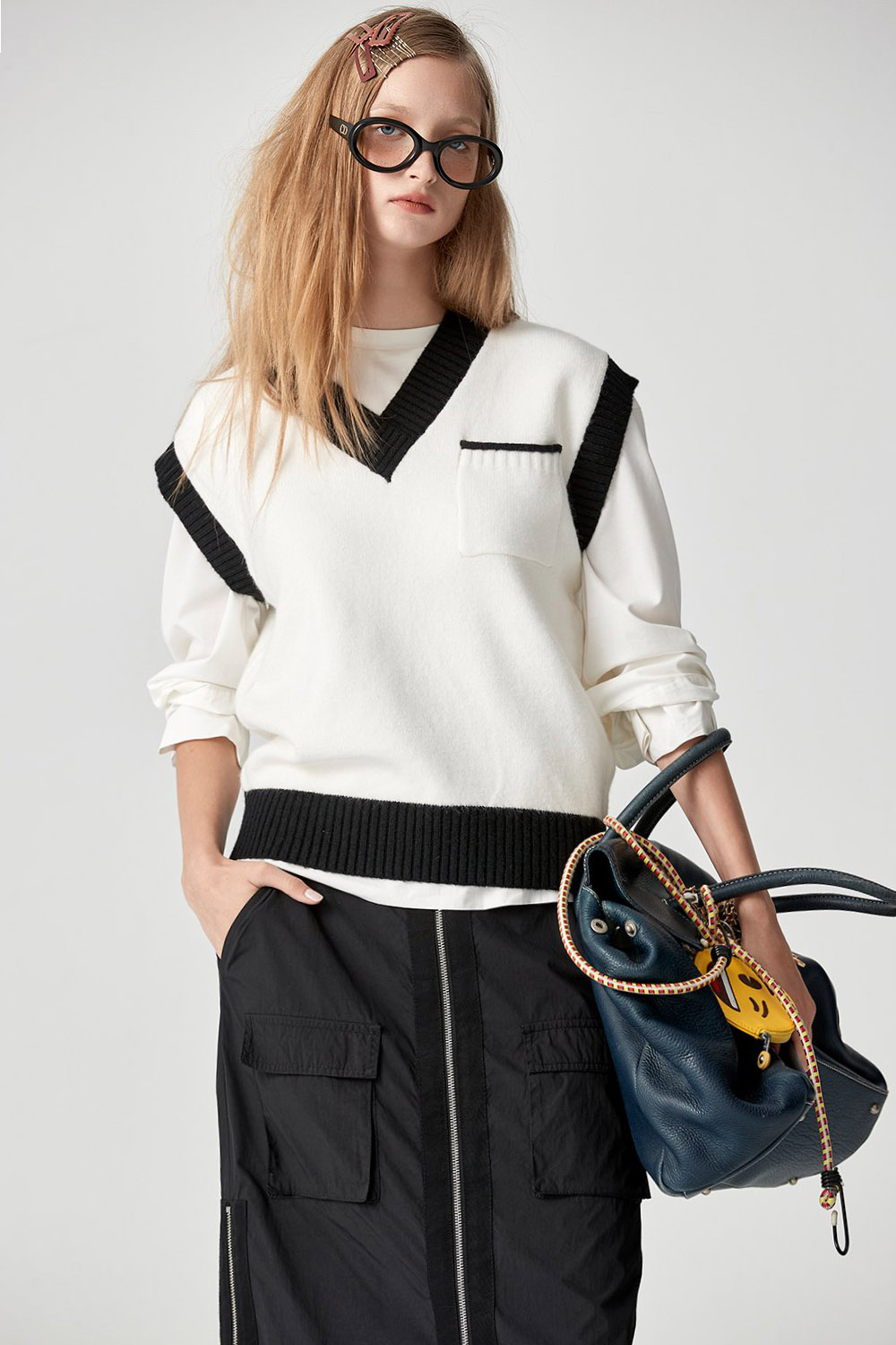 墨黑雪白V領針織上衣 - 無瑕純白, 40