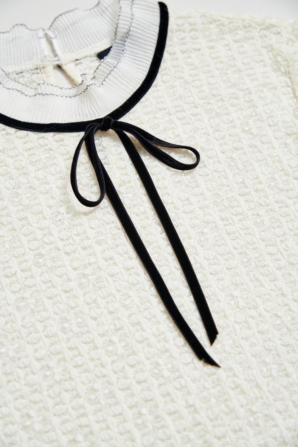 霜夜輕白彈力蕾絲荷葉立領上衣 - 奶油杏色, 36