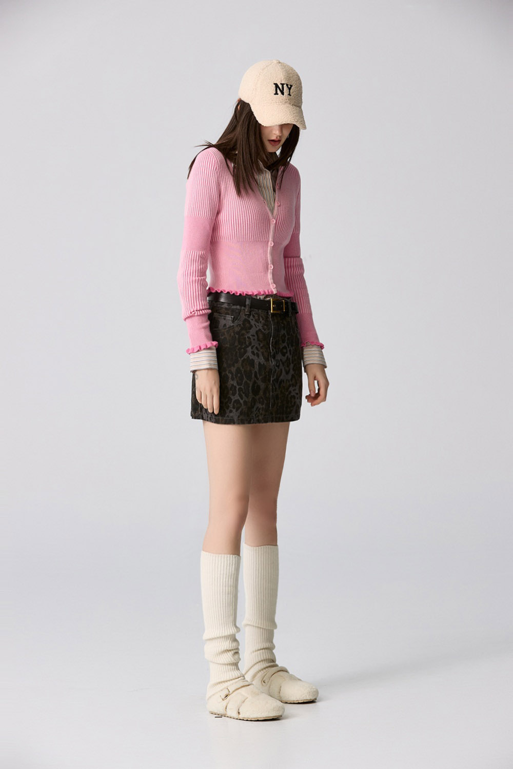 晨曦淡粉坑條荷葉邊針織外套 - 古典藕粉, 36