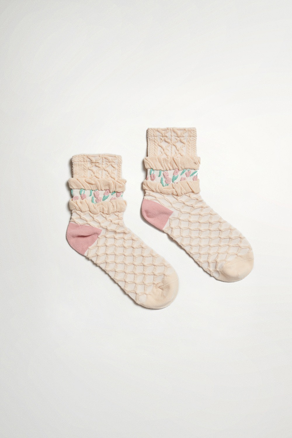 羅曼蒂克荷葉邊鬱金香中筒襪 - 奶油杏色, F
