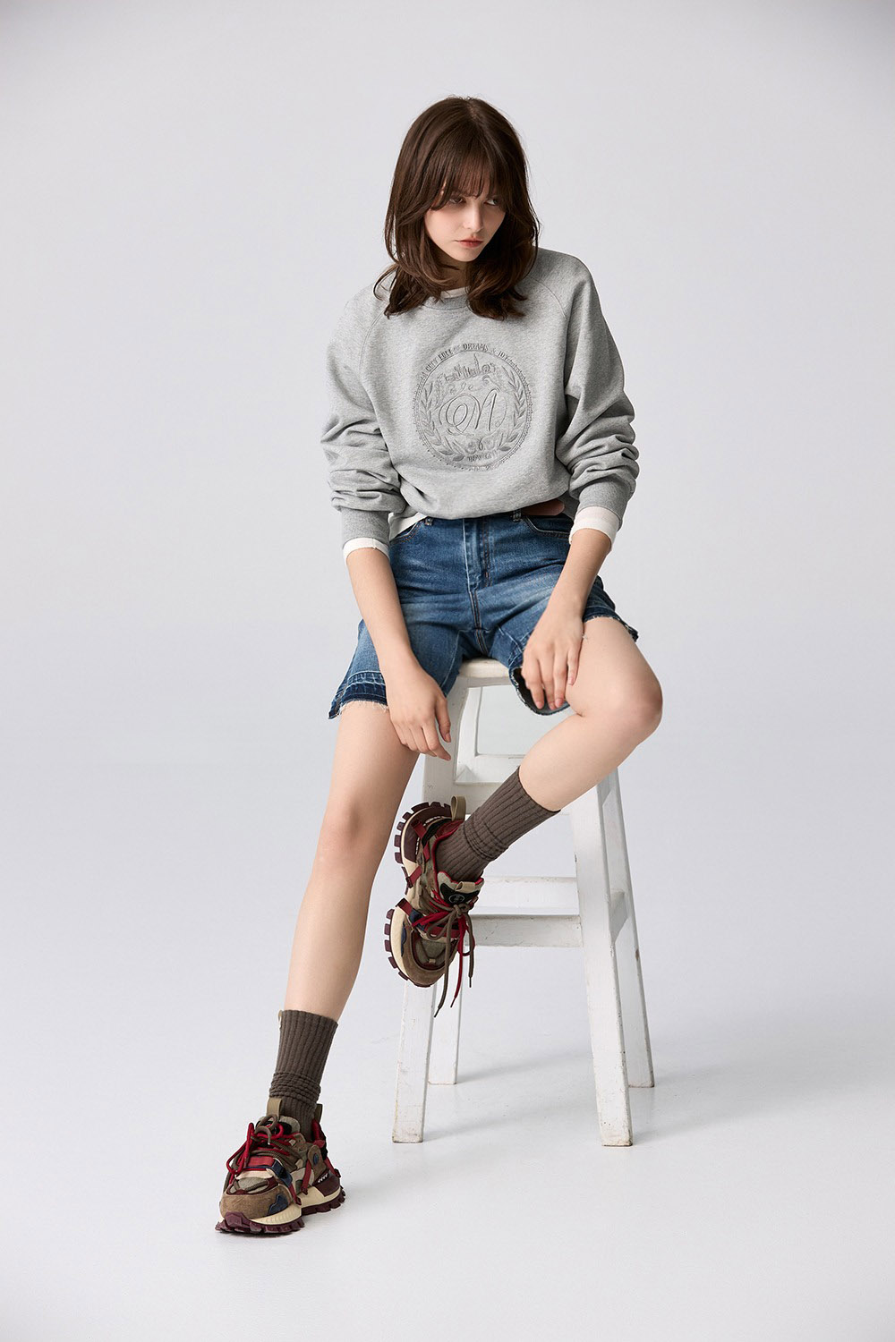 輕盈霧灰大LOGO刺繡圓領上衣 - 沉穩霧灰, 36