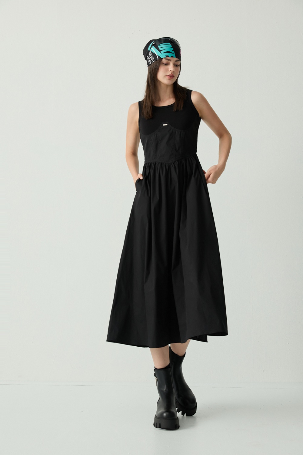 低調休閒異材質剪接洋裝 - 亮光黑, 40