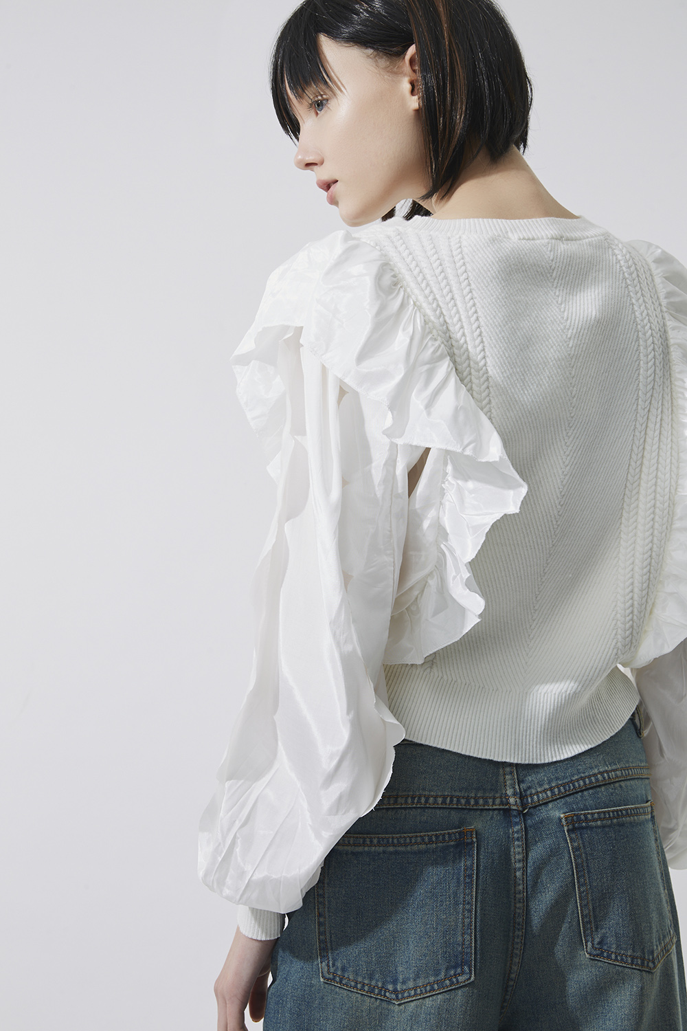溫柔日常荷葉拼接澎袖針織上衣 - 無瑕純白, L