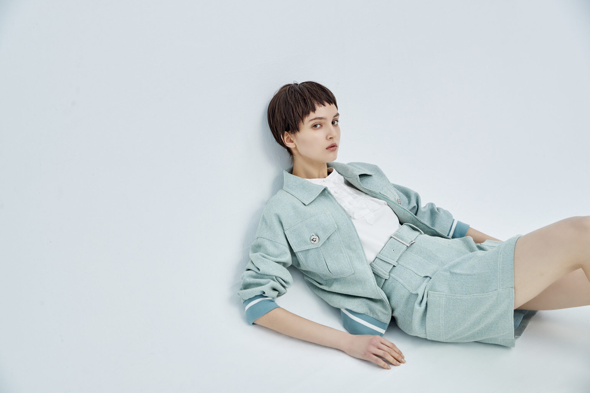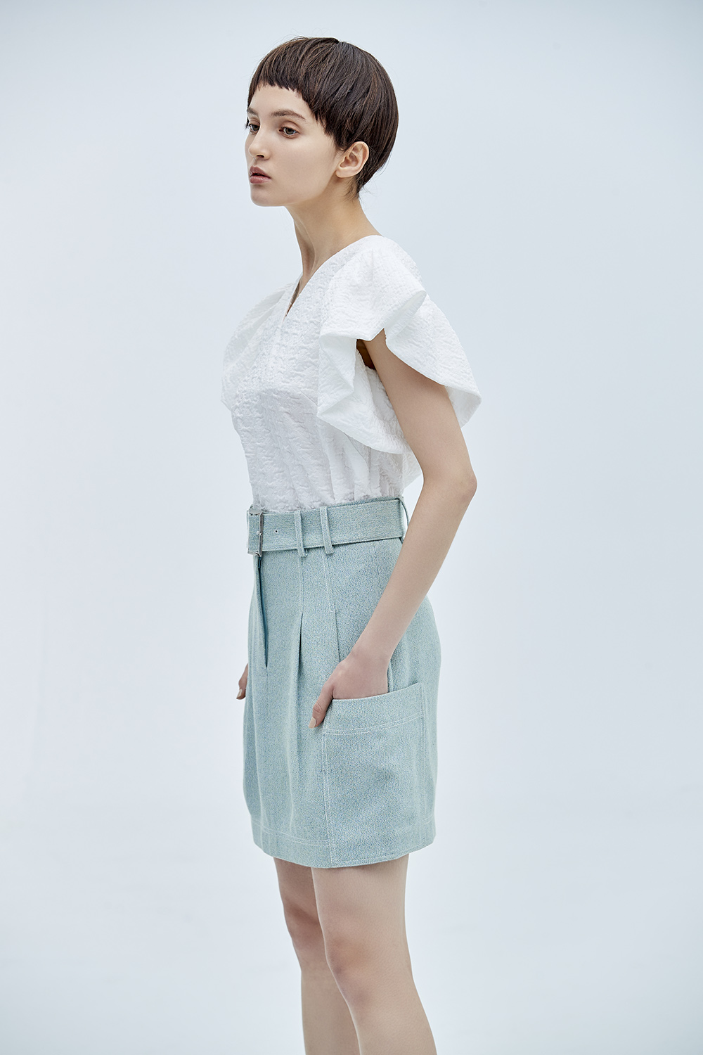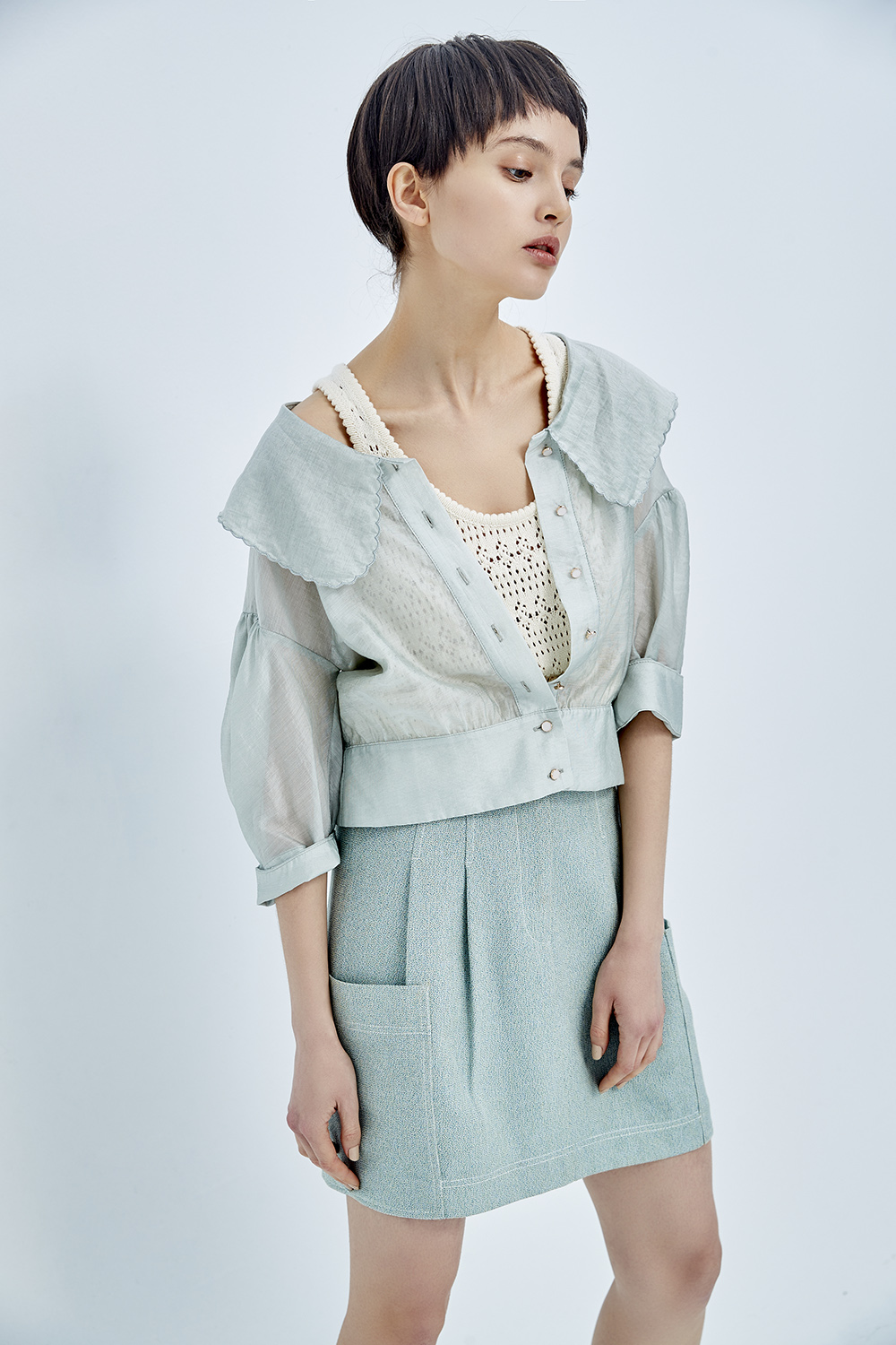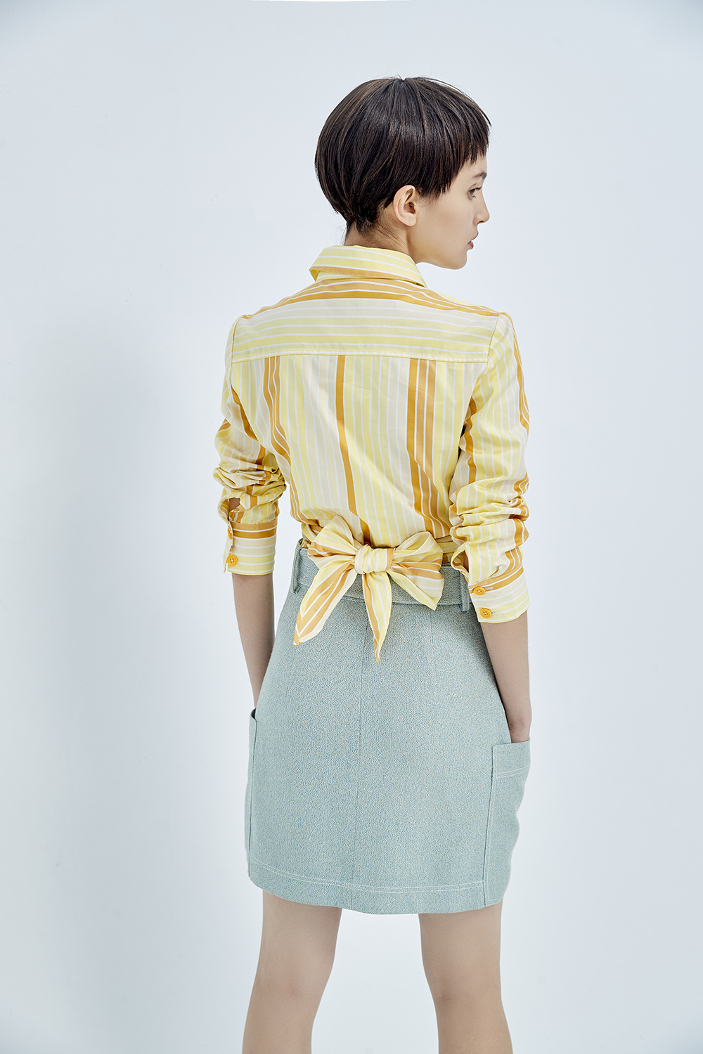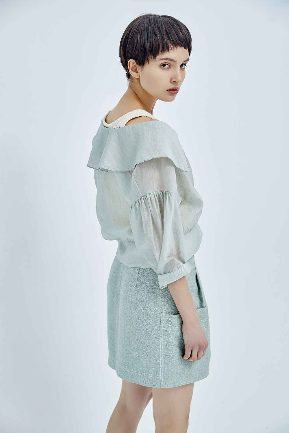隨著裙襬揚起灰綠的輕柔 成為春日裡的一抹清新。