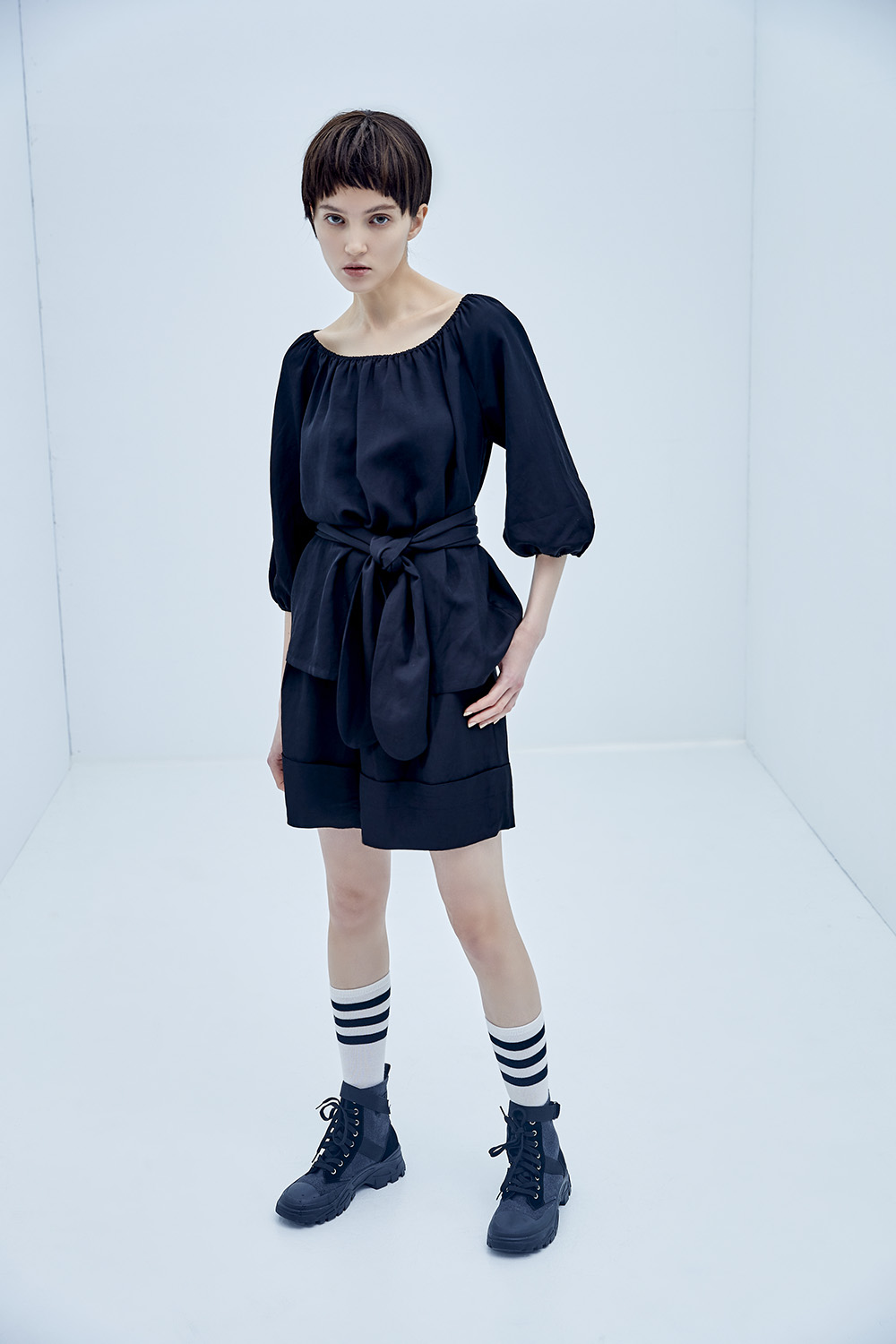 溫潤淡然鬆緊式綁帶澎袖上衣(附綁帶) - 神祕純黑, S