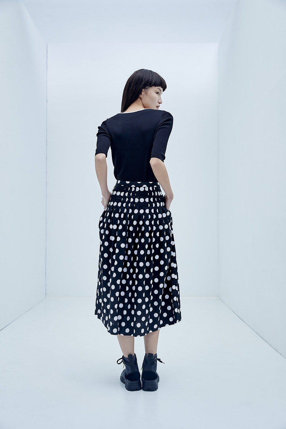 搖搖姿態波點細壓褶飄逸中長裙 - 神祕純黑, M