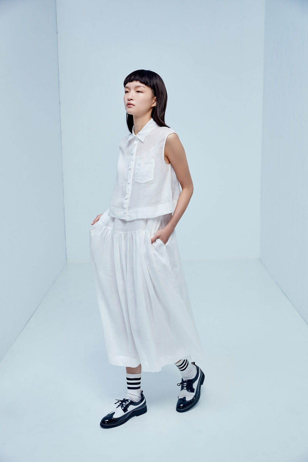 慕白時刻棉麻無袖排釦兩件式洋裝