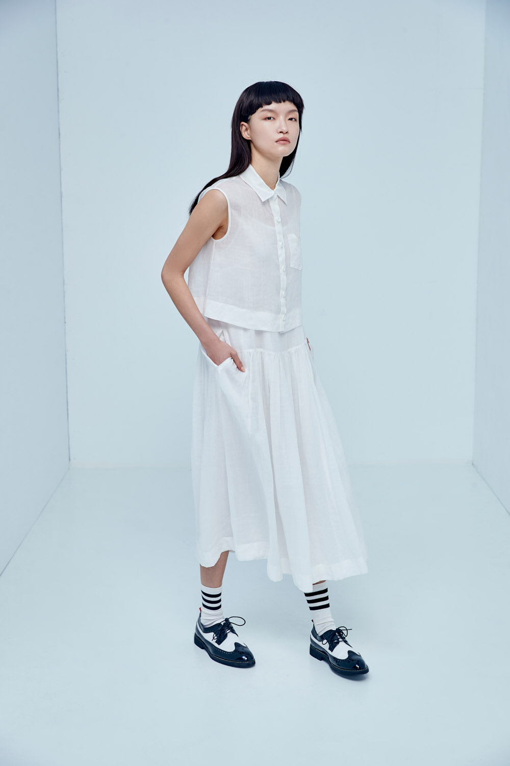 ◈當妳將鈕釦一打開,可以看見內裡的長裙選用細肩帶設計,讓夏日的炎熱在此獲得涼感的舒解,裙襬摺上細褶營造百褶般的堆疊感,也透過兩件式設計讓穿搭擁有更多變化。