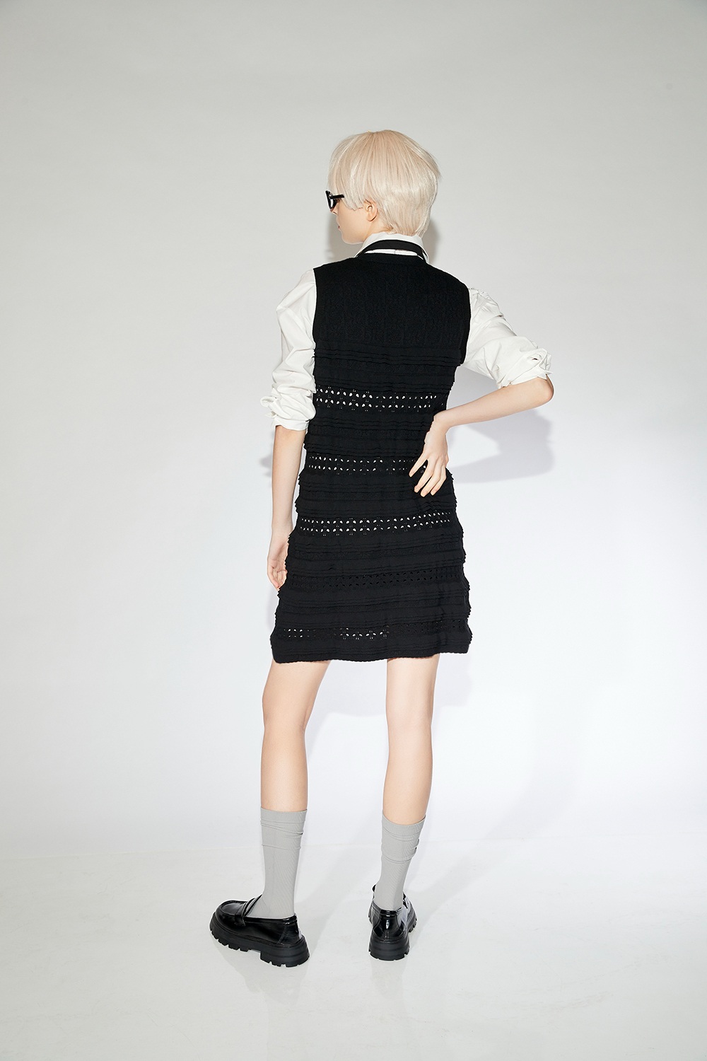 小步漫舞無袖壓花荷葉拼接鏤空針織洋裝 - 神祕純黑, S
