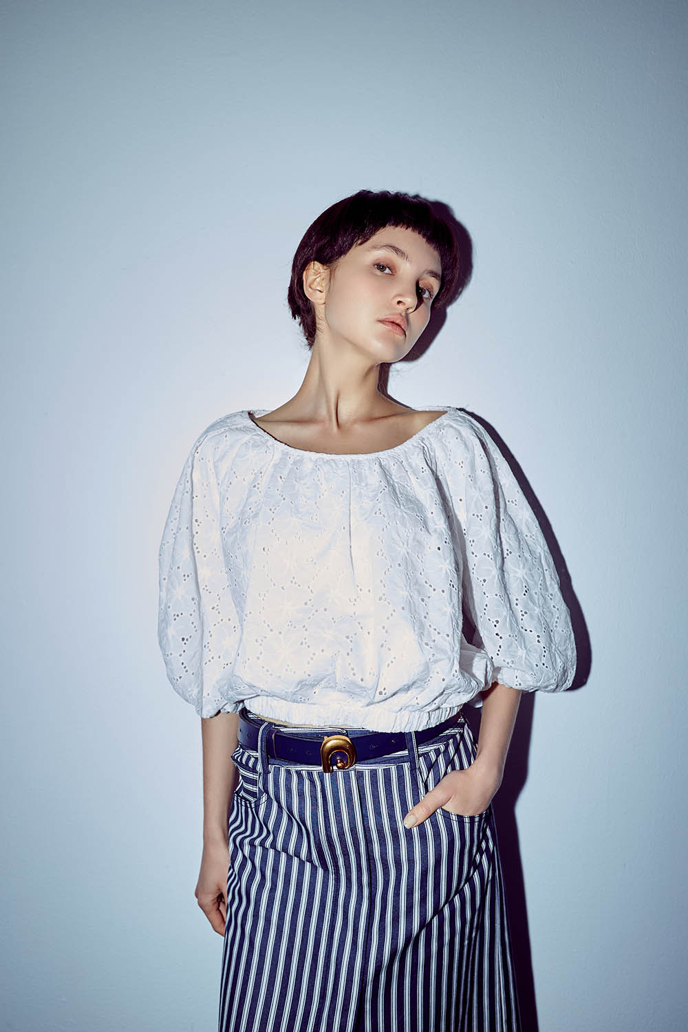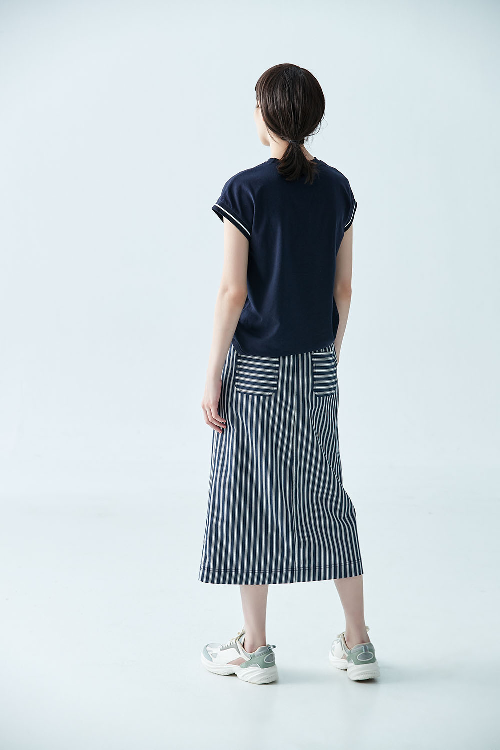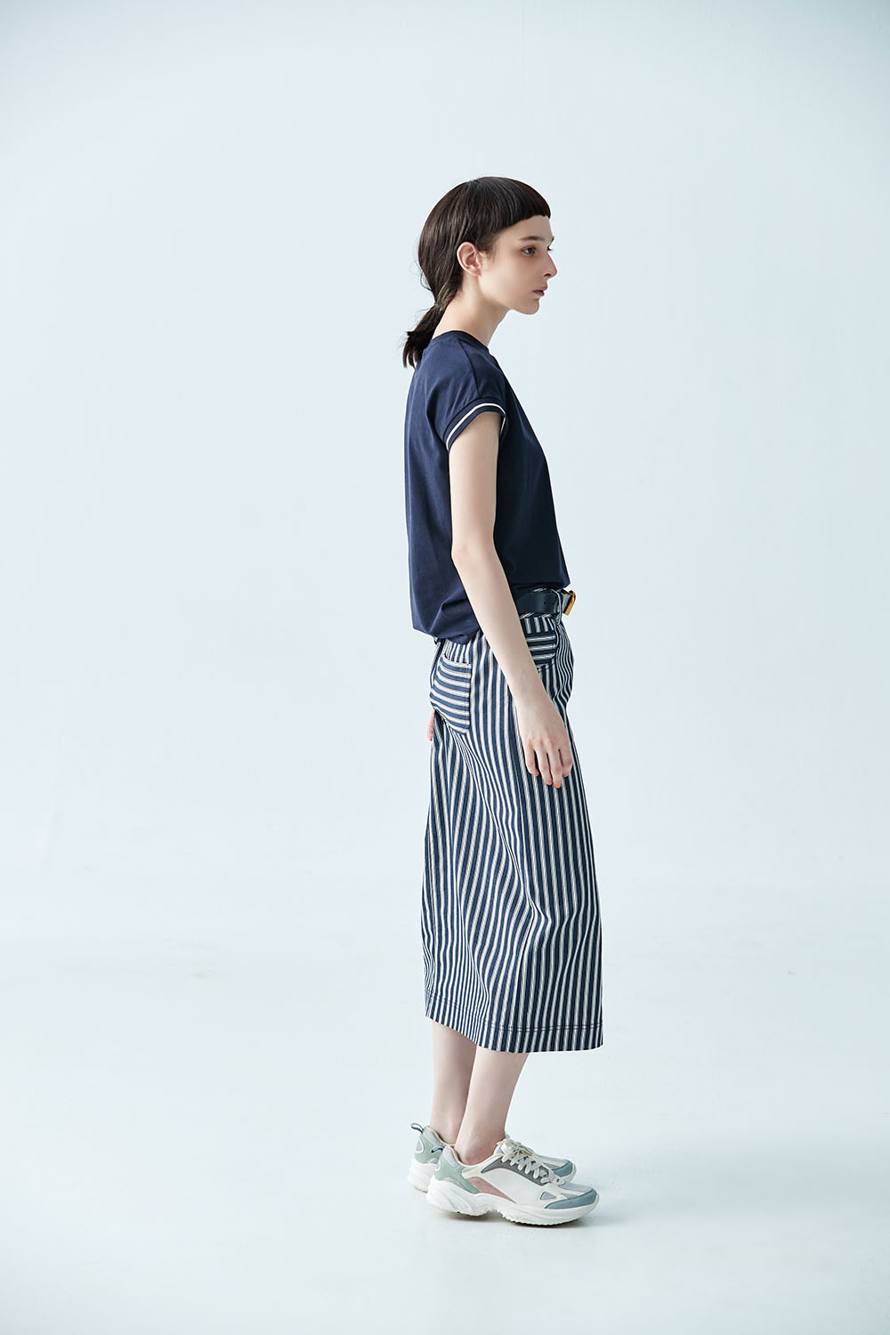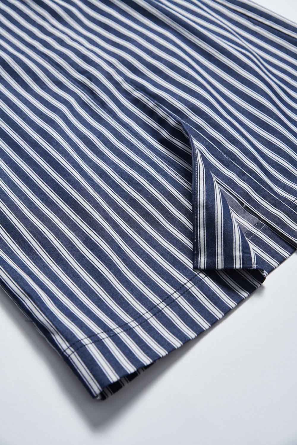 ◈直條紋讓腿型在視覺上顯得更為修長,也帶妳跳脫單色的簡約,享受著靛藍穿梭在身型裡的快意,綴上鈕釦可以恣意穿脫。