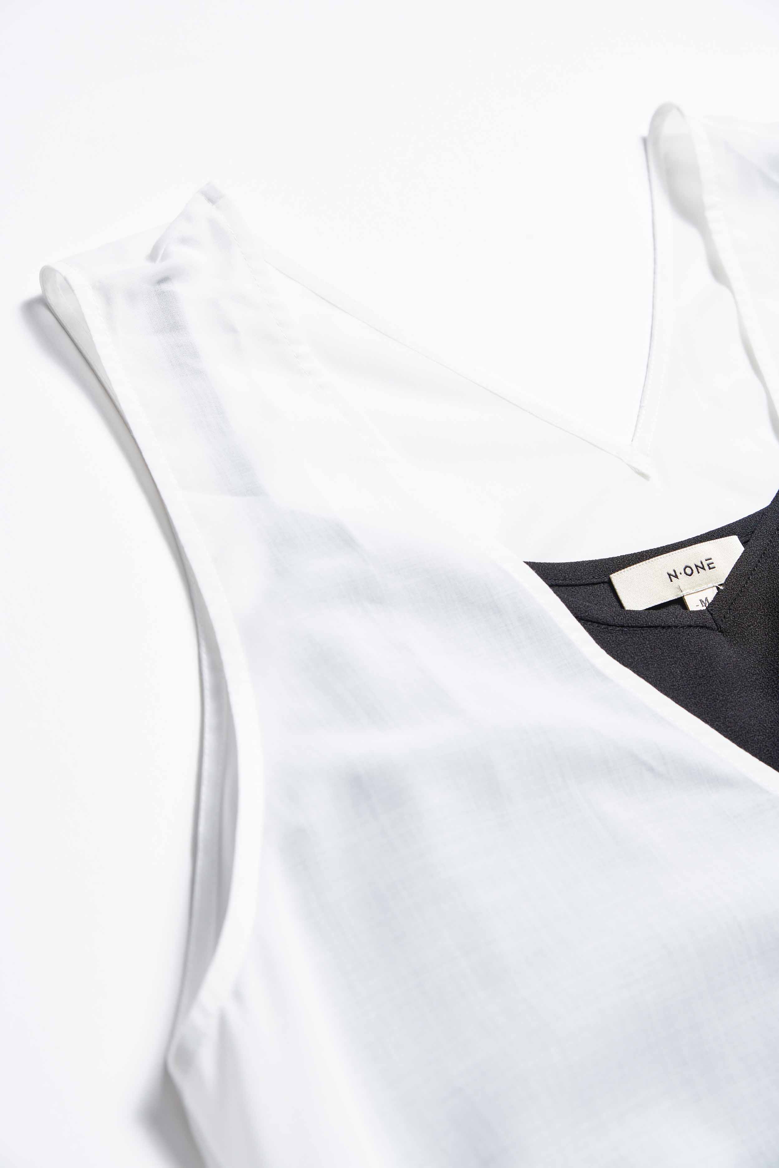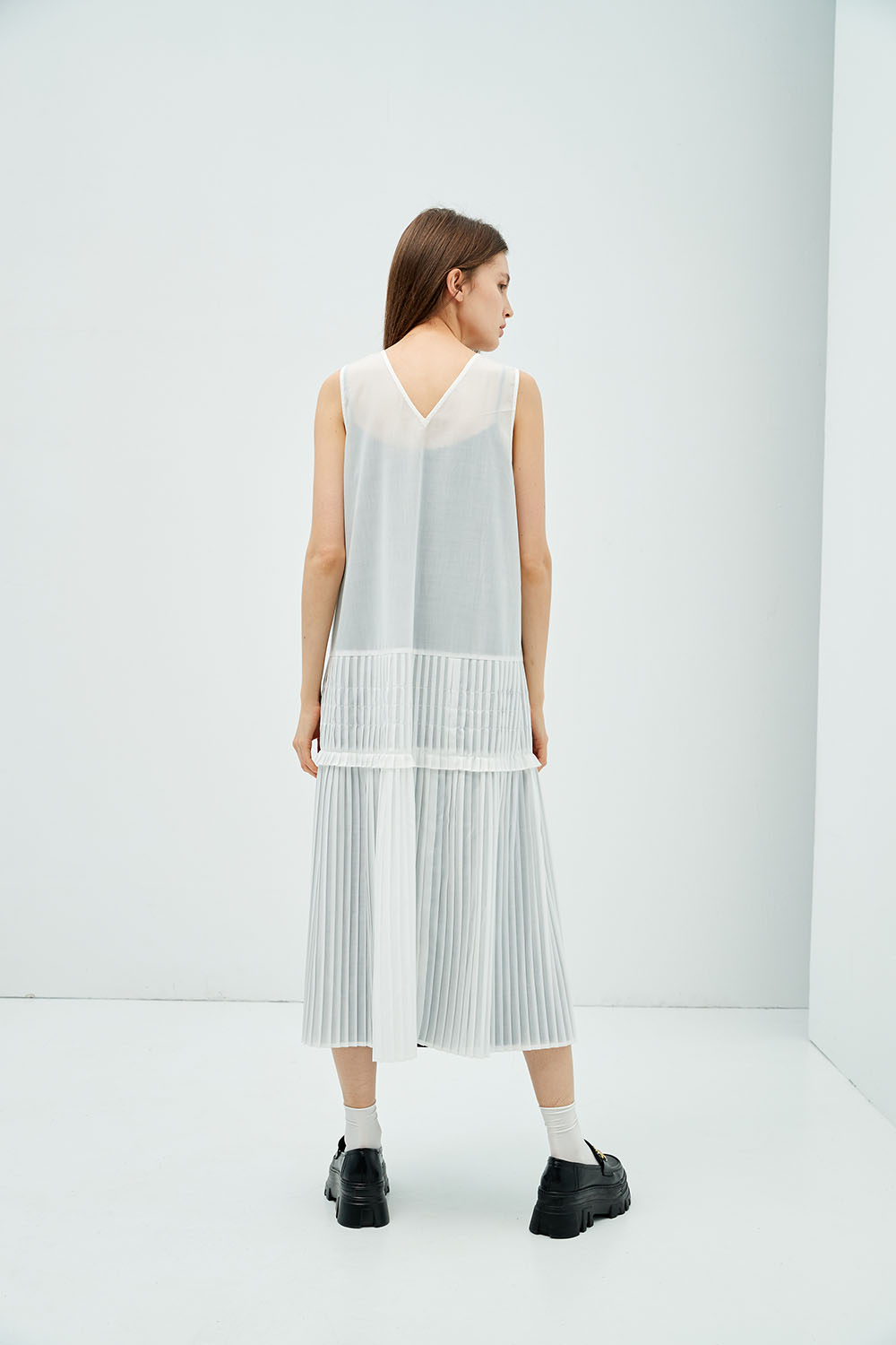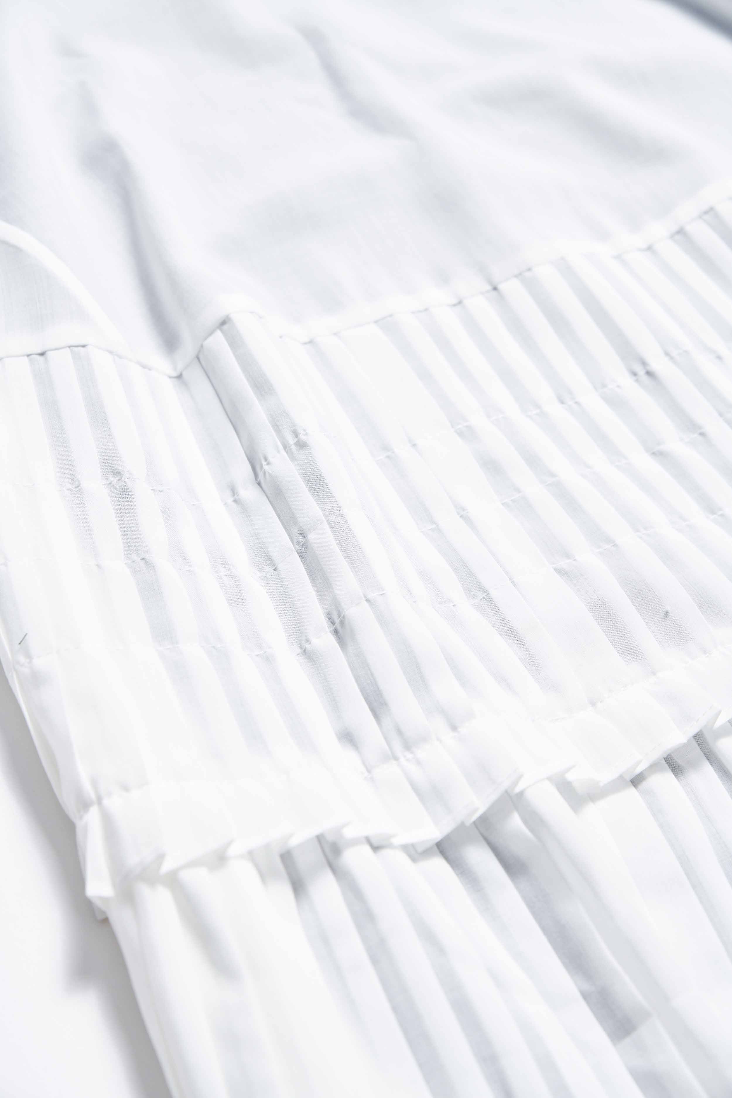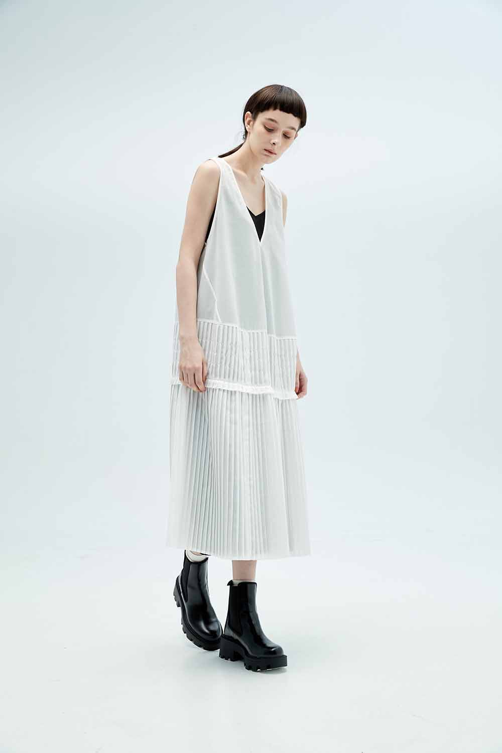 晨霧飄揚兩件式細褶拼接V領背心洋裝 - 無瑕純白, L