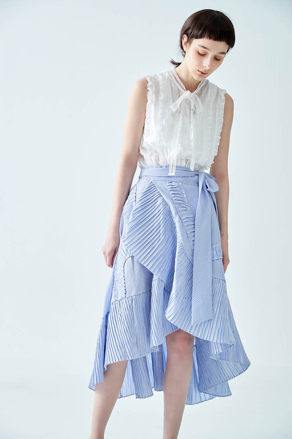 層疊花襬細褶拼接綁帶裙 - 寧靜黛藍, F