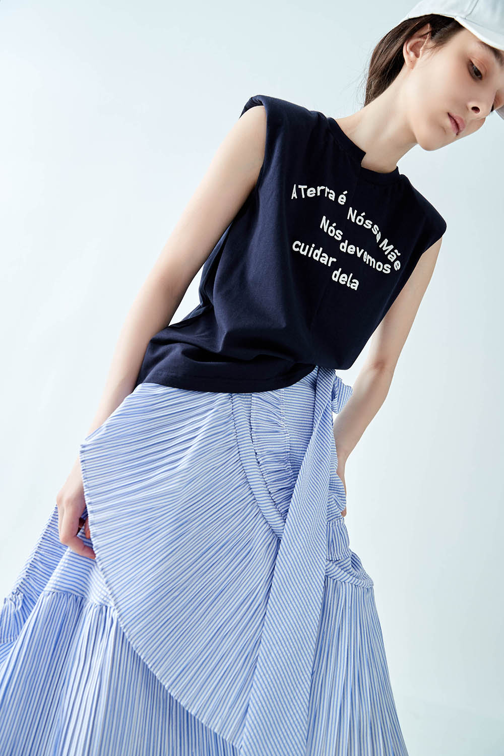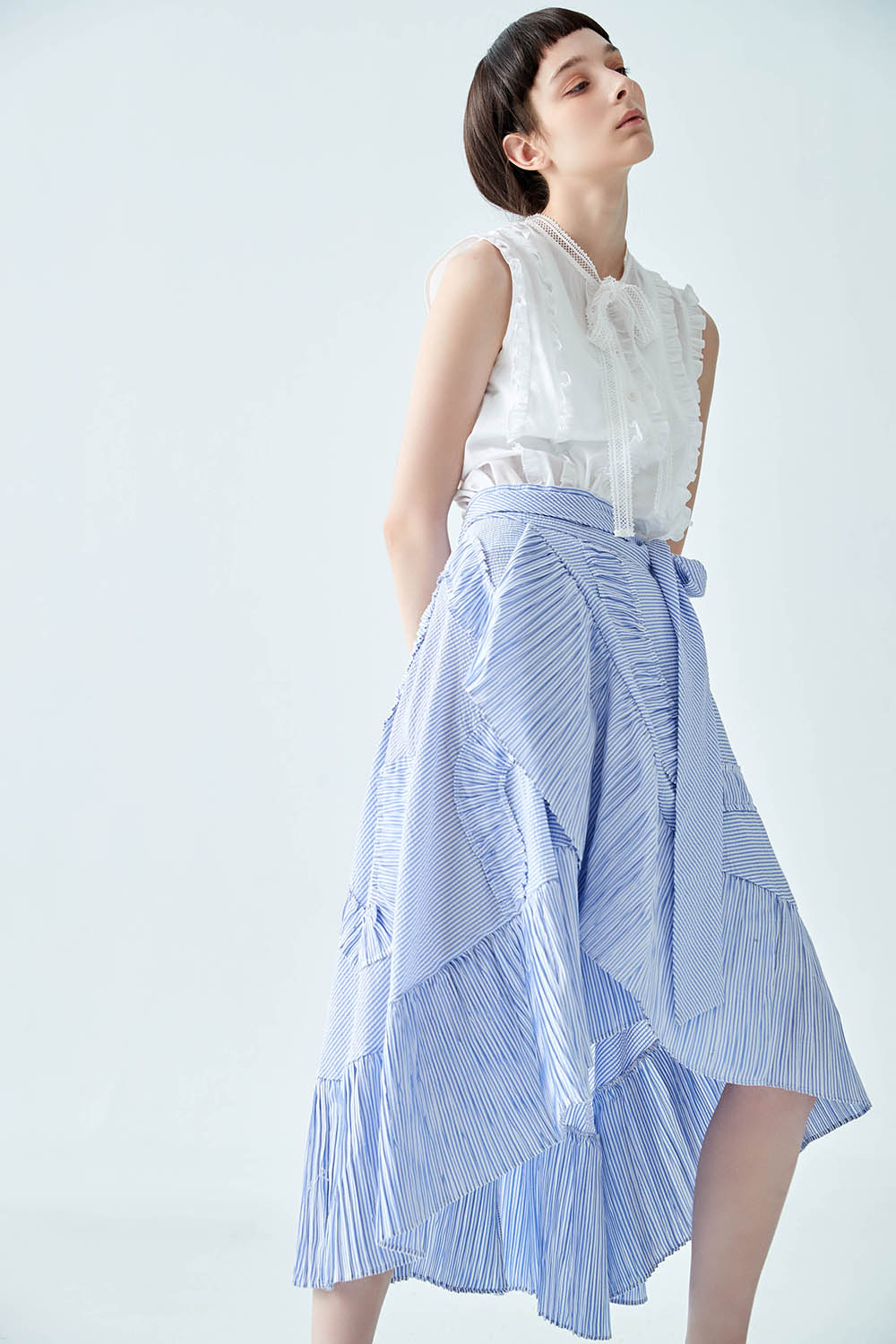 ⌜踏進以天藍為基調的世界,妳看見藍色賦予的晴朗,感受裙上的層層漣漪,妳讓微風穿越指尖,深深地擁抱自己⌟