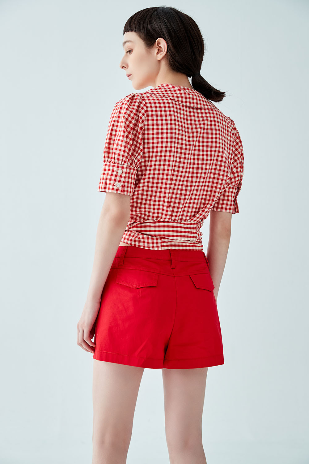 舒活格紋裹式綁帶翻領澎袖上衣 - 耀眼赤紅, S