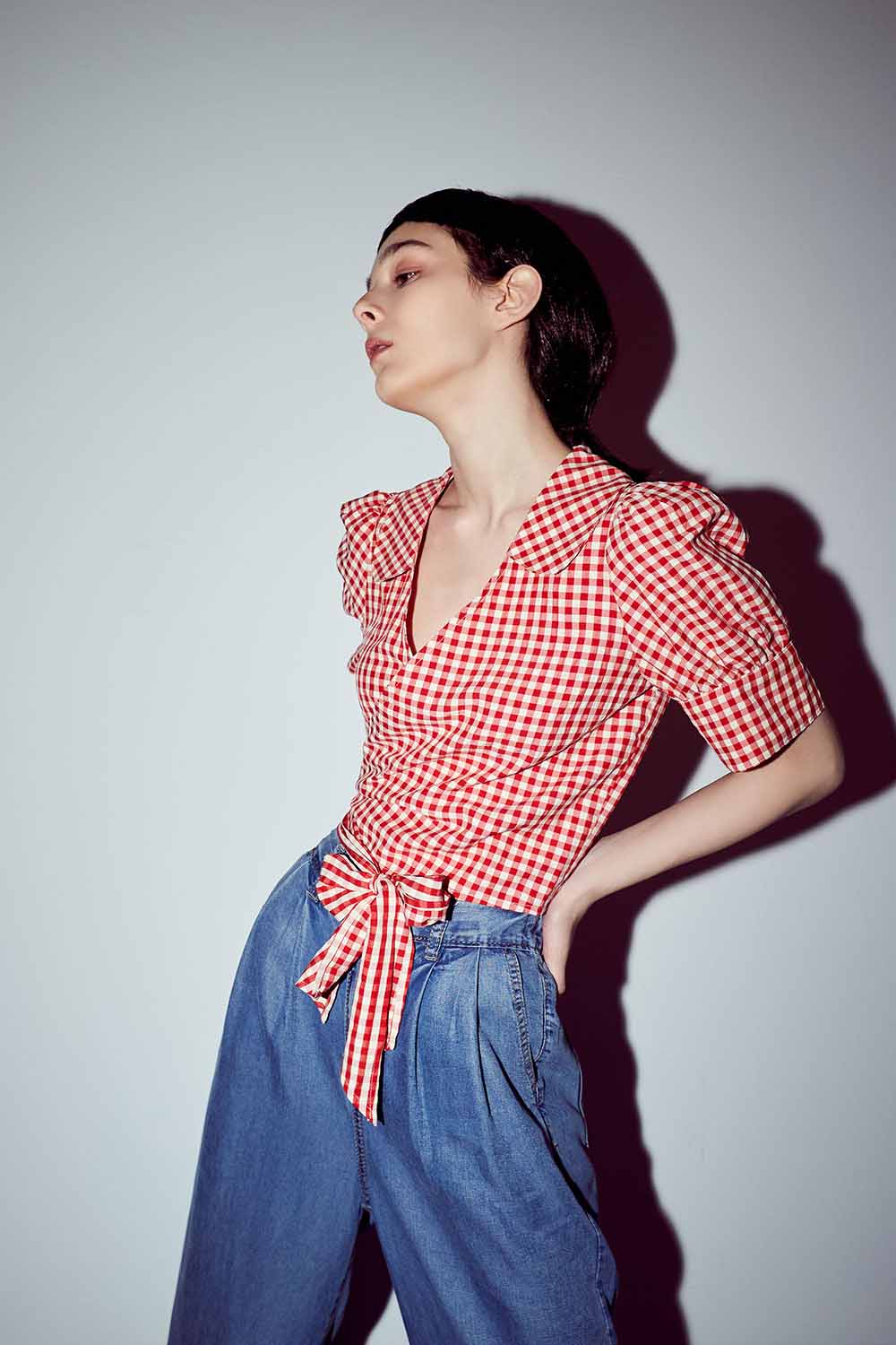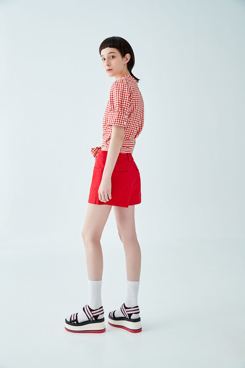 舒活格紋裹式綁帶翻領澎袖上衣 - 耀眼赤紅, M