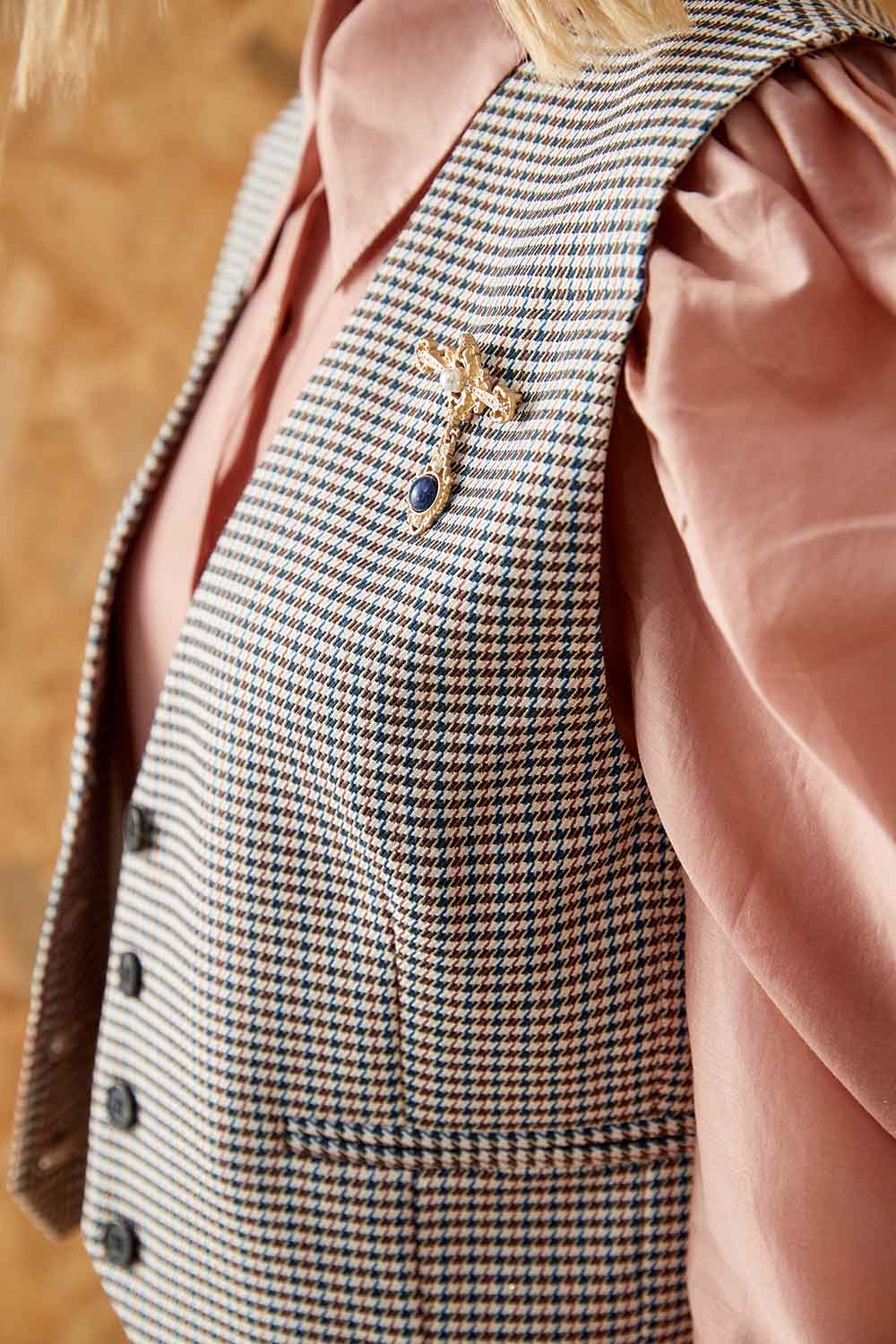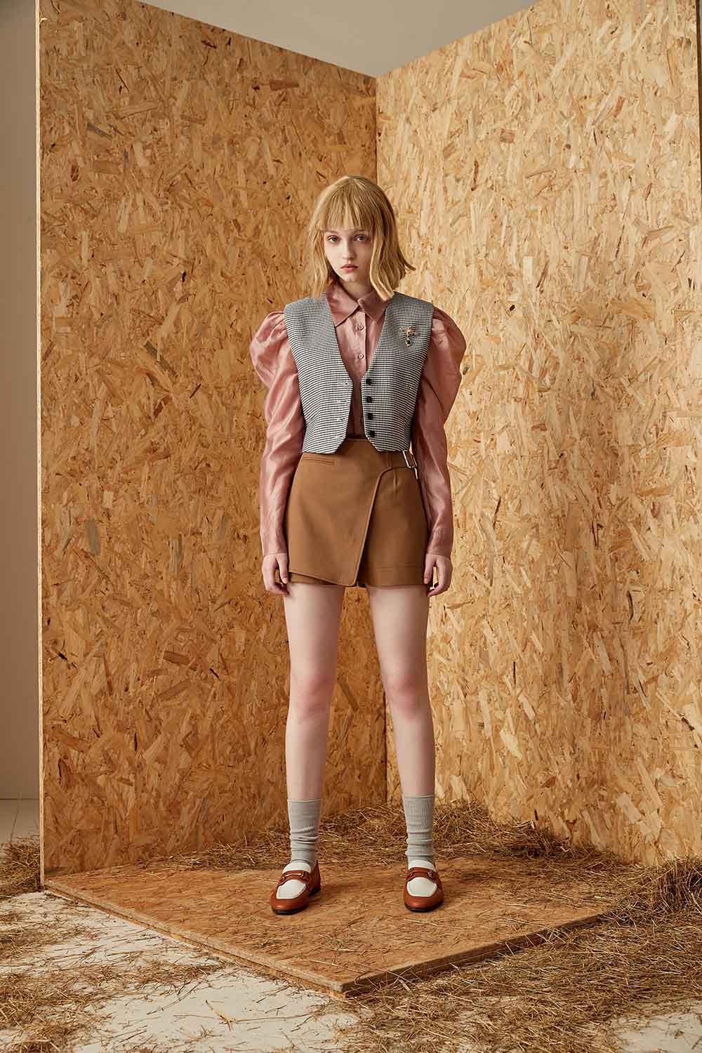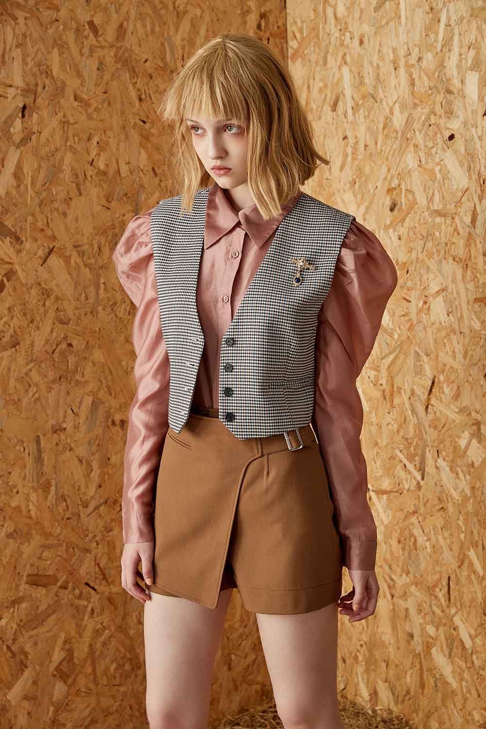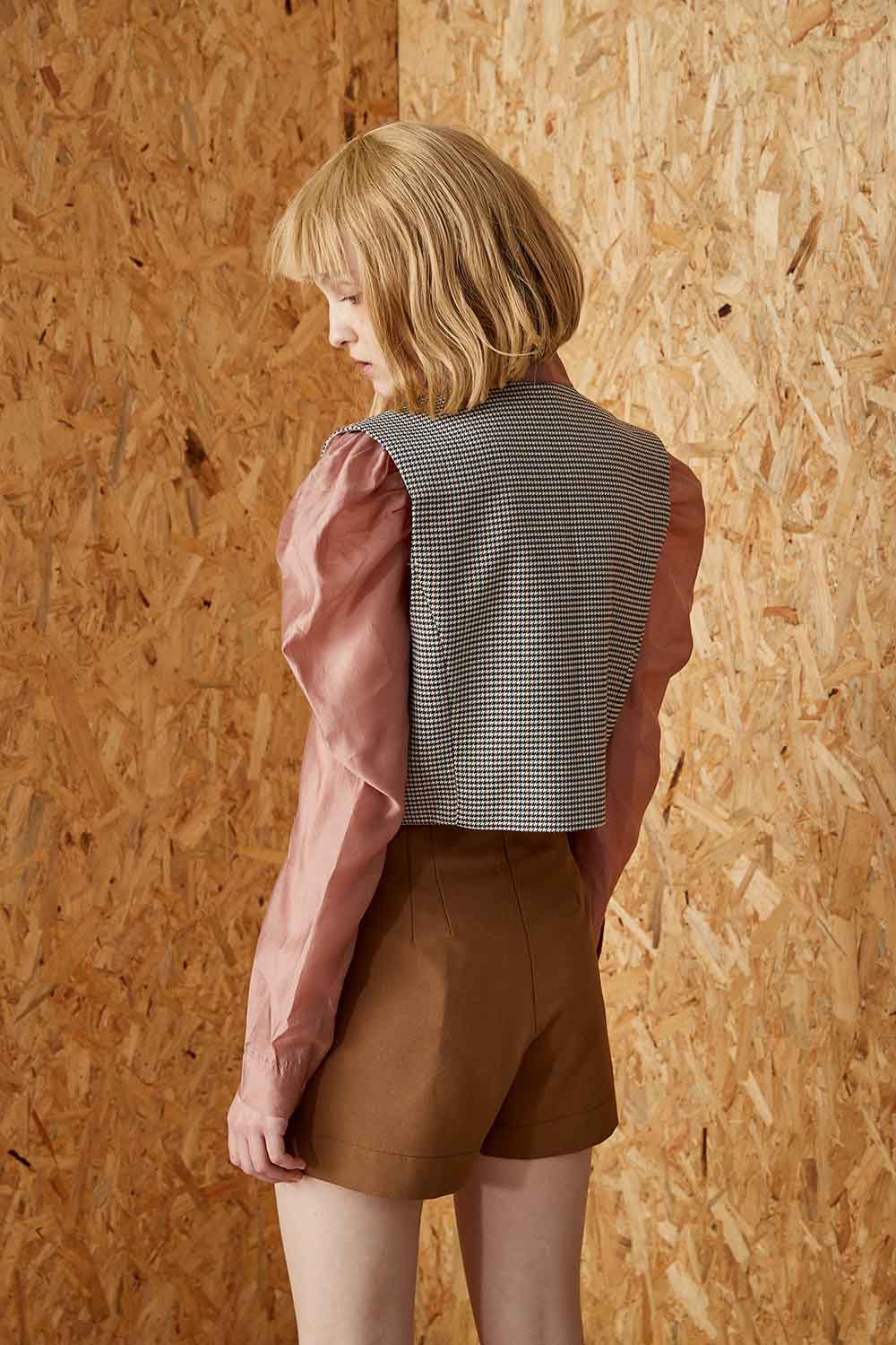 ◈佐以V領設計讓內裡的服裝色彩可以展露而出並且與背心進行一種和諧的搭配,再綴上深色排釦呼應秋日的沈穩,連衣著上也透過秋日色彩交織出千鳥格造型,為背心添上獨立自主的意識。