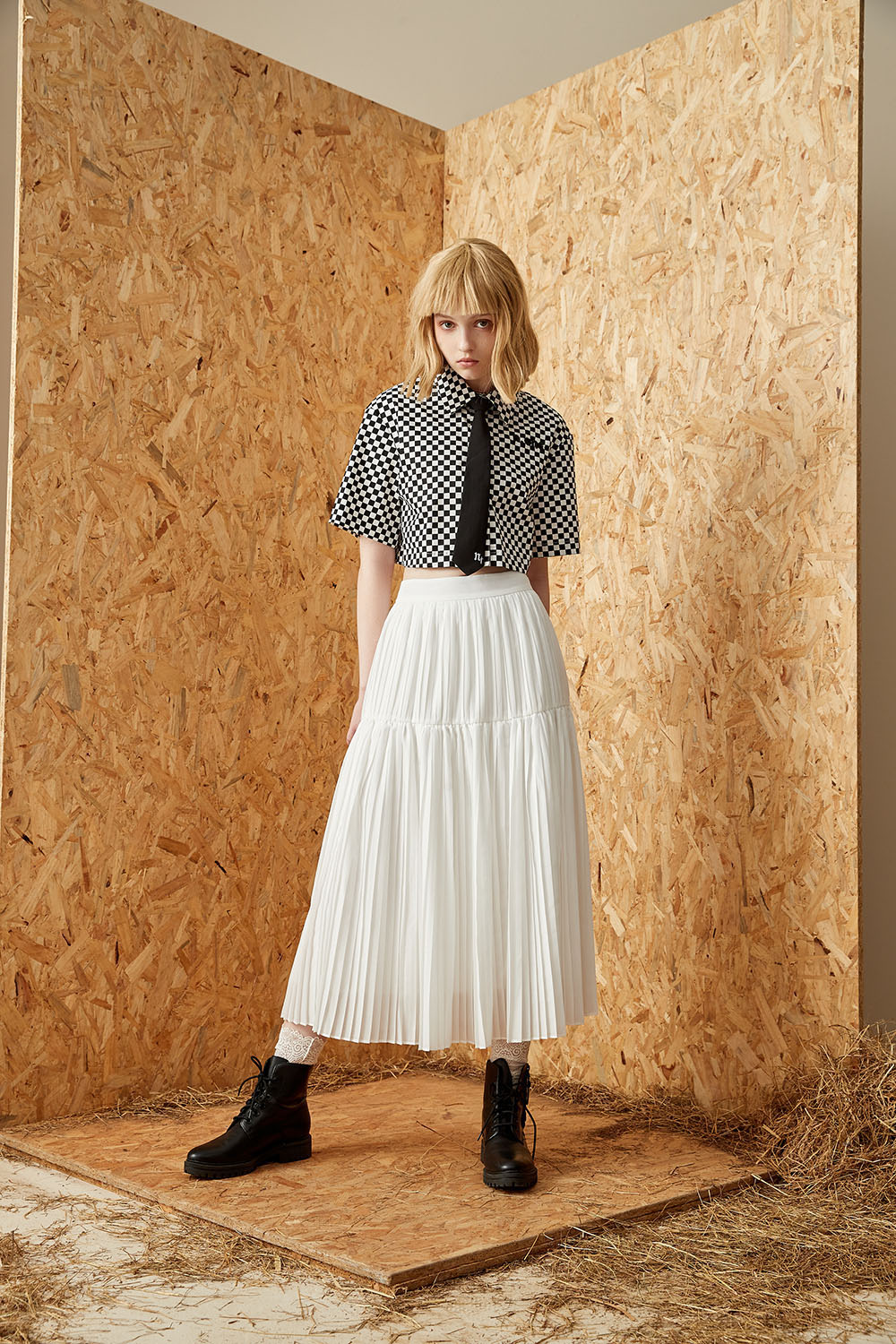 大擺的長裙,配上有個性的黑白棋盤格,在顯個性之間又帶點女人味。